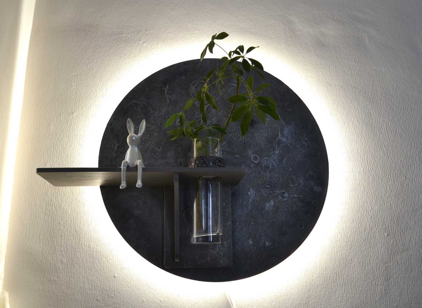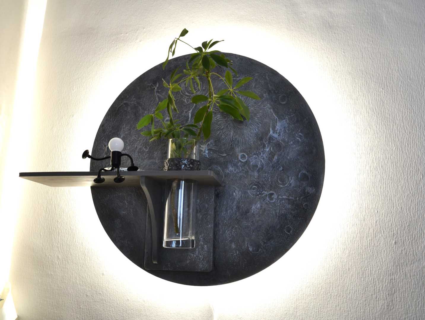 Авторское настенное панно в виде луны с мягкой подсветкой — стильное решение для современного интерьера. Объёмная фактура поверхности передаёт эффект настоящего лунного рельефа.