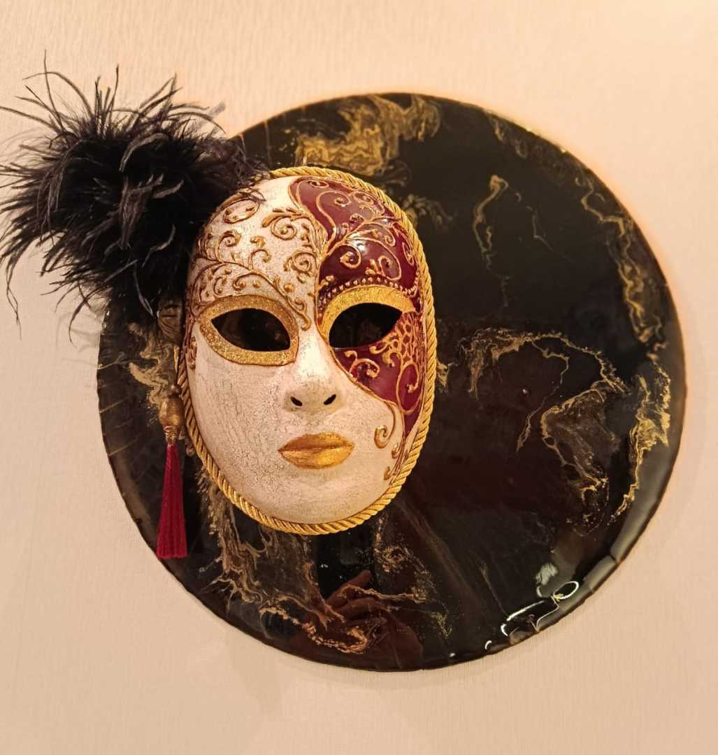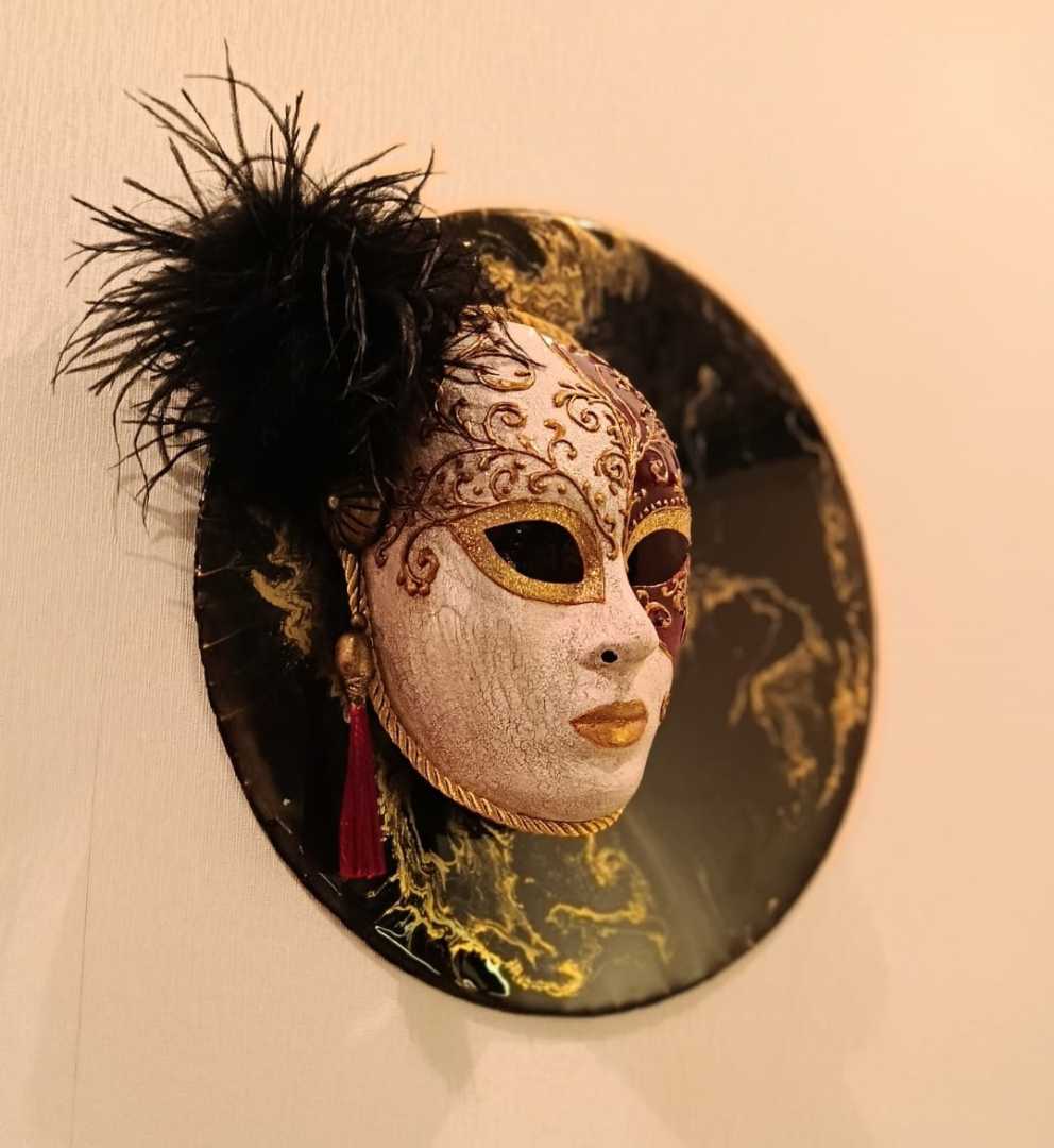 материал маски: основа из пластика, акриловые краски, декоративные элементы, страусовые перья, маска снимается.