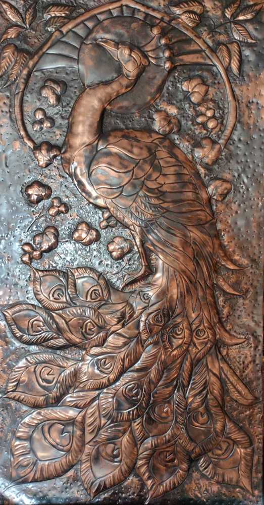 Авторская картина с изображением Жар-птицы, выполненная в технике чеканки по меди. Рельефная поверхность и тёплый металлический оттенок создают выразительный декоративный эффект.