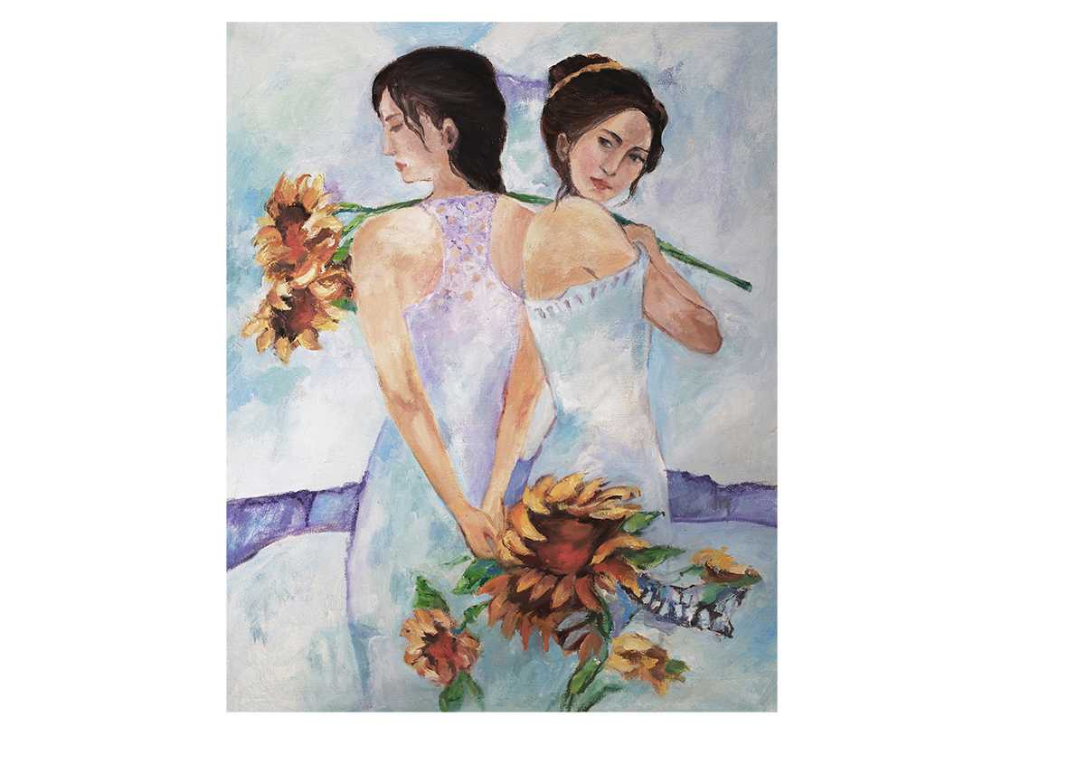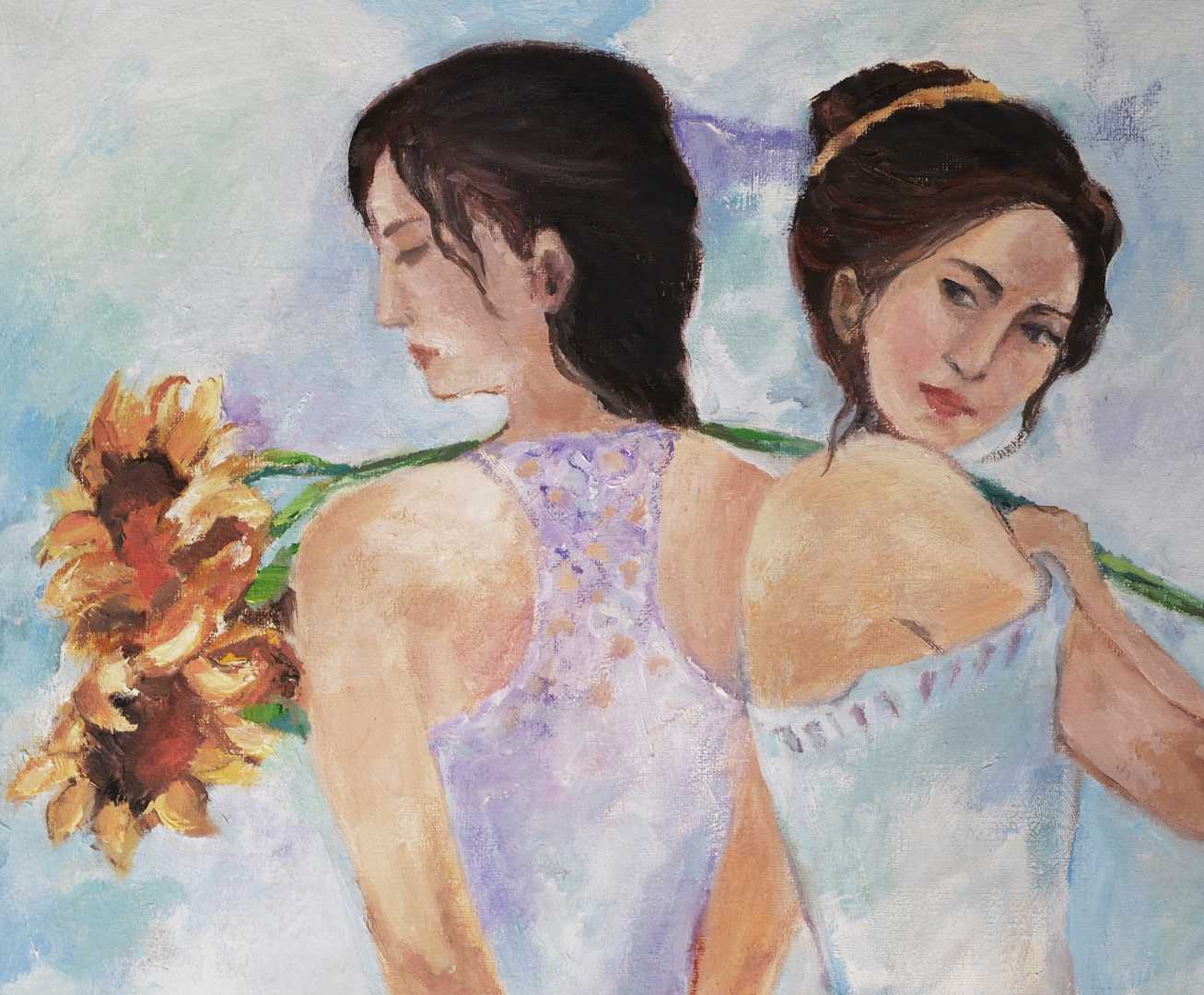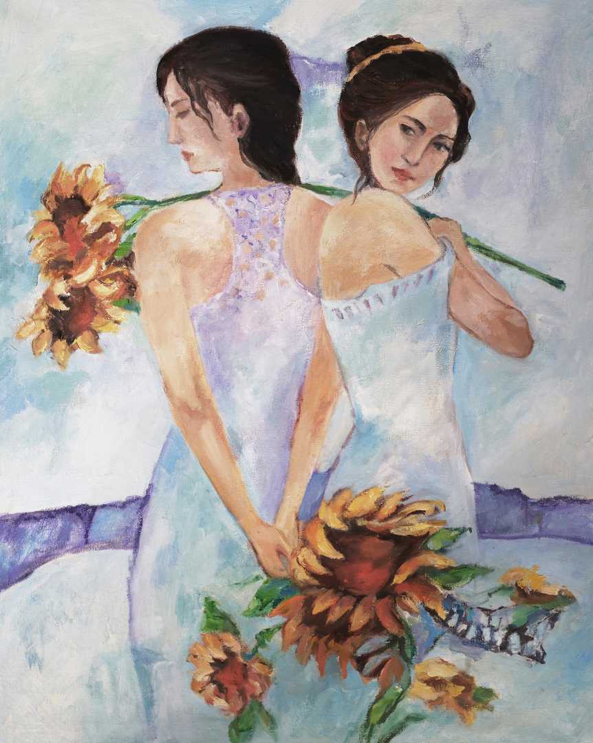 Лёгкая и светлая композиция, в которой два женских образа окружены яркими подсолнухами. Картина наполнена теплом, мягкостью и атмосферой летнего света.