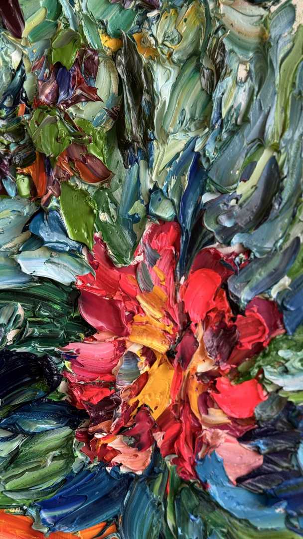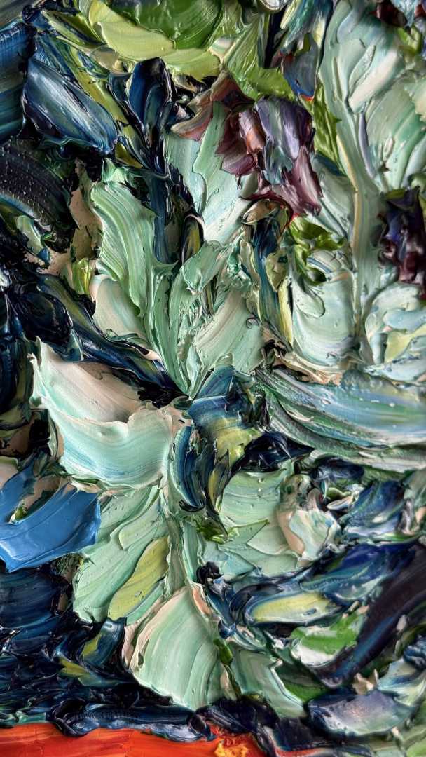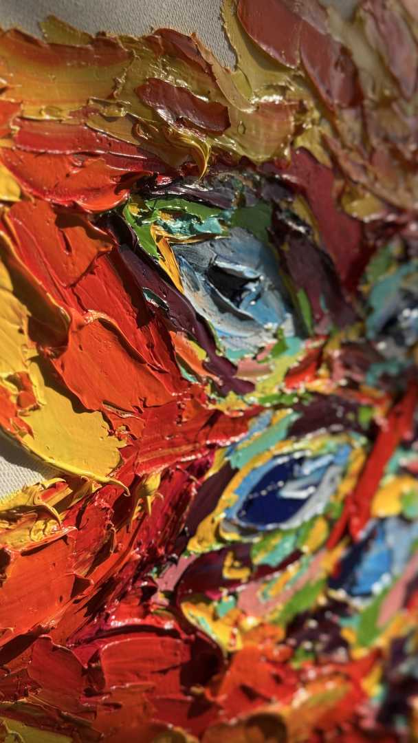 Рельеф до 10 мм создаёт второй план восприятия: живопись становится скульптурой. При боковом освещении поверхность оживает — тени и свет меняются вместе с положением зрителя. Работа не одинакова утром и вечером.
