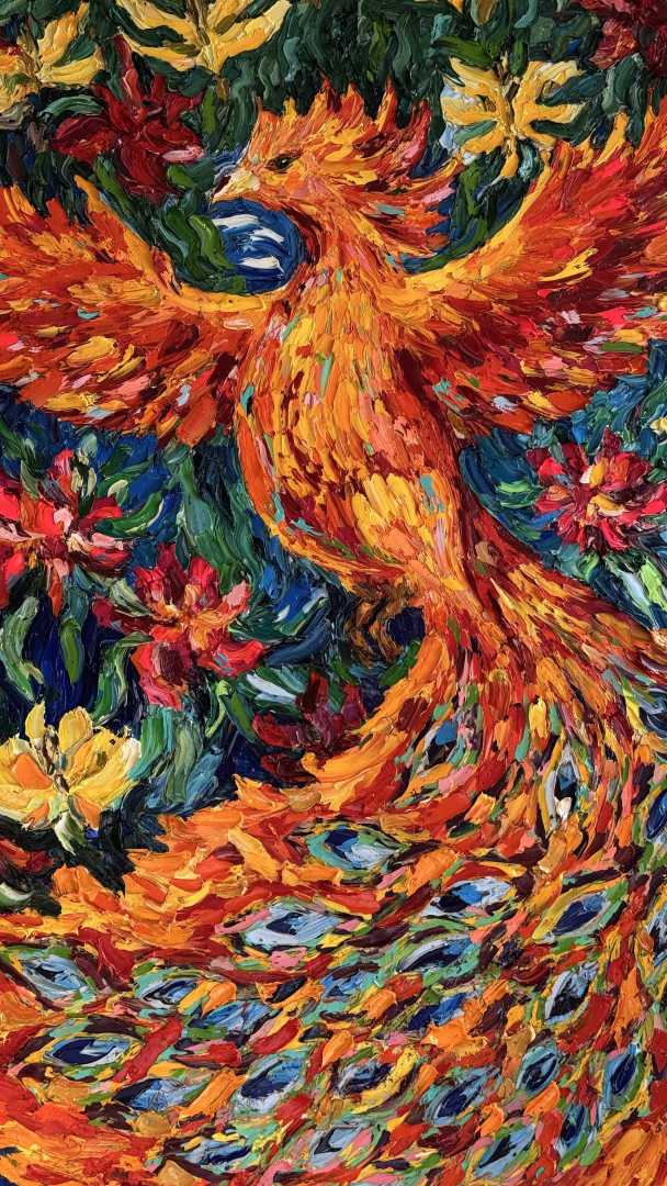 за, начала и конца. Феникс не летит куда-то — он существует в вечном настоящем, окружённый садом Курандеро как пространством трансформации.