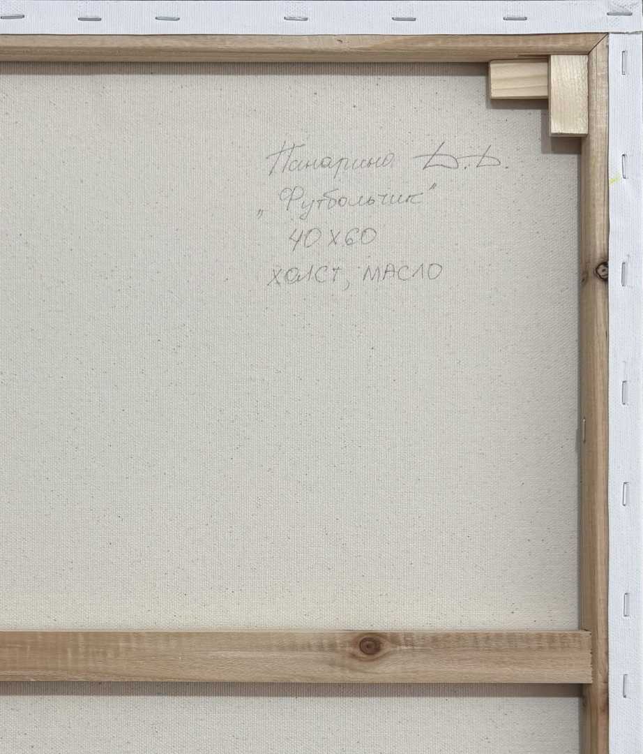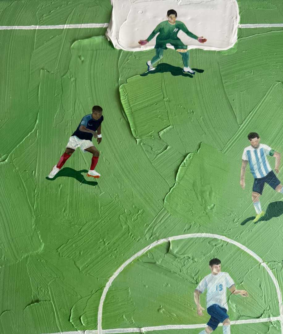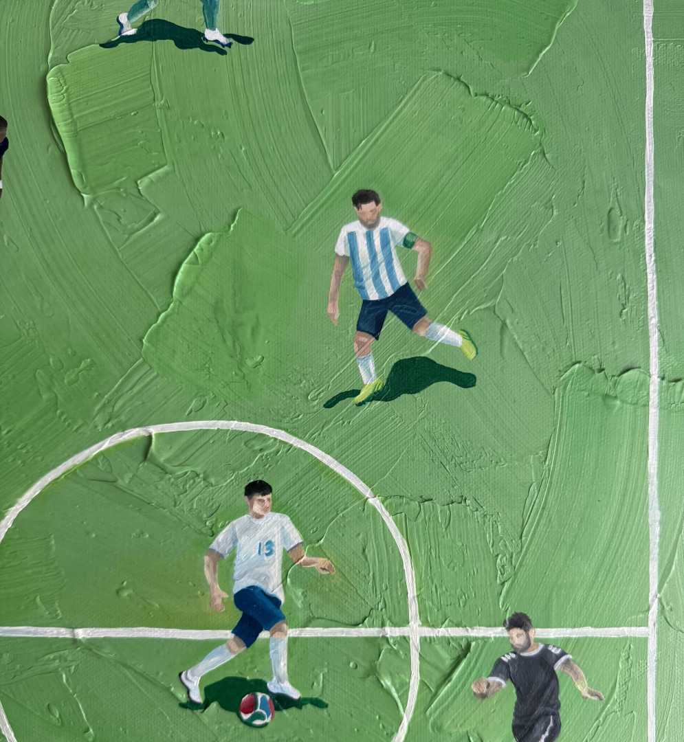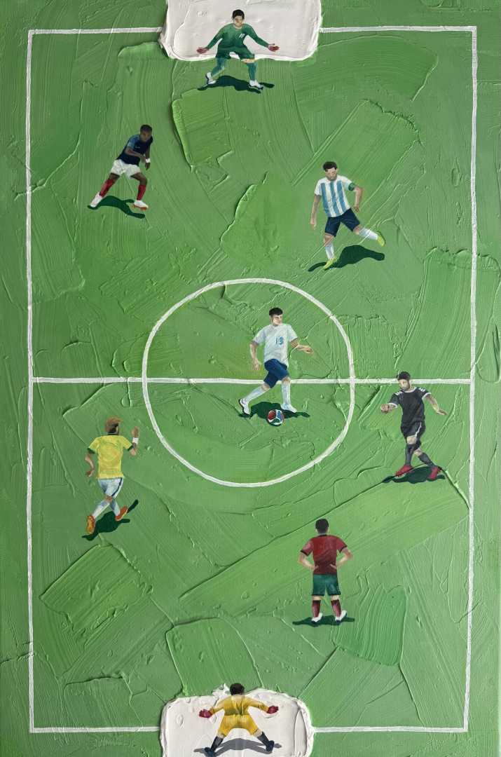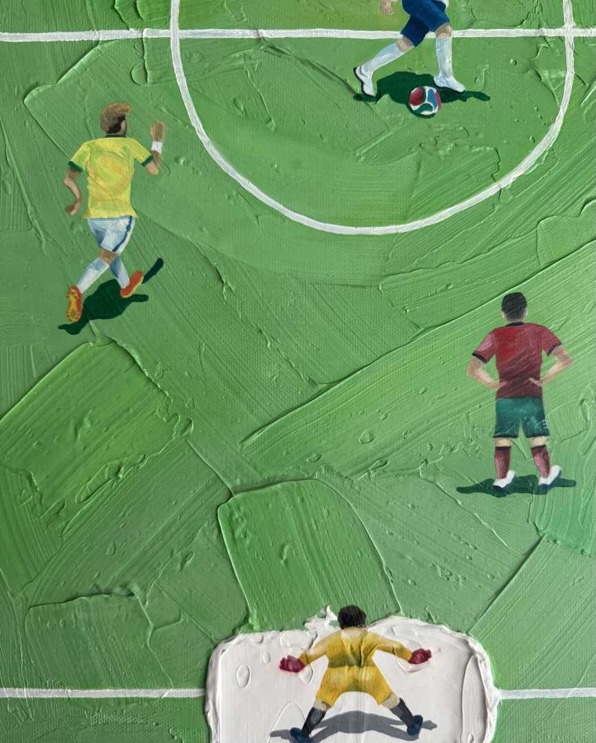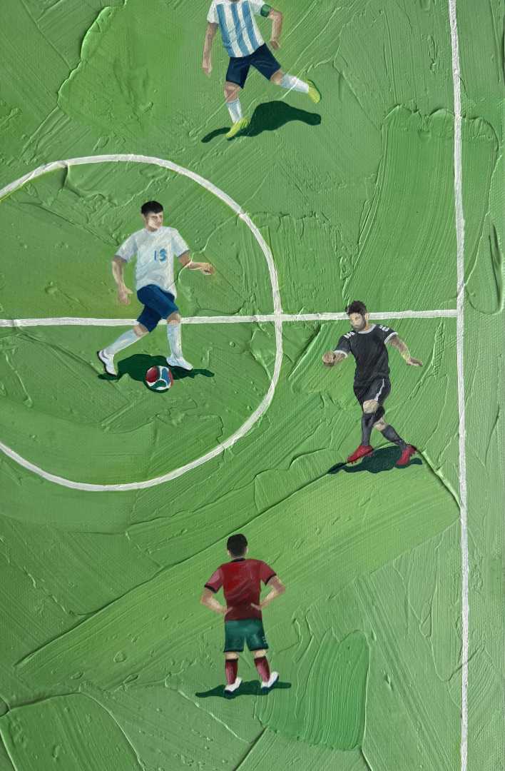 На картине изображён динамичный момент футбольного матча, выполненный в оригинальном художественном стиле. Композиция построена с видом сверху («птичий полёт»), что создаёт ощущение присутствия на поле и позволяет охватить всю сцену целиком.