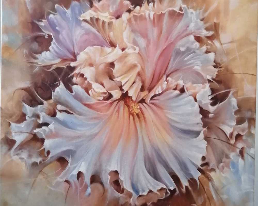 Авторская картина с изображением ириса, выполненная в мягкой живописной манере с акцентом на форму и воздушность лепестков. Крупный план цветка позволяет рассмотреть плавные линии и переливы оттенков.