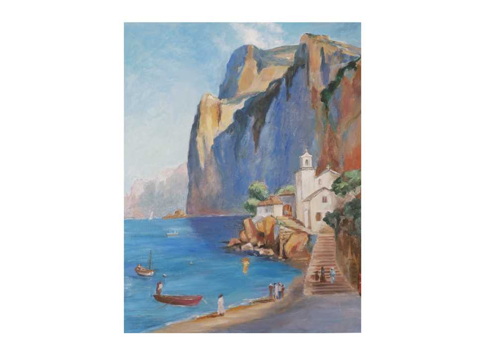 Живописная картина с морским пейзажем и горами, передающая атмосферу спокойствия и гармонии. Побережье с лодками, мягкий свет и величественные скалы создают ощущение уюта и простора.