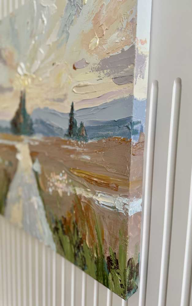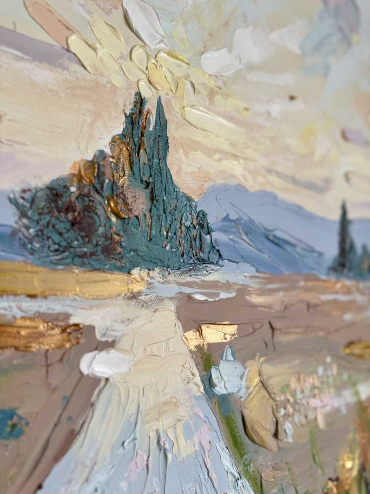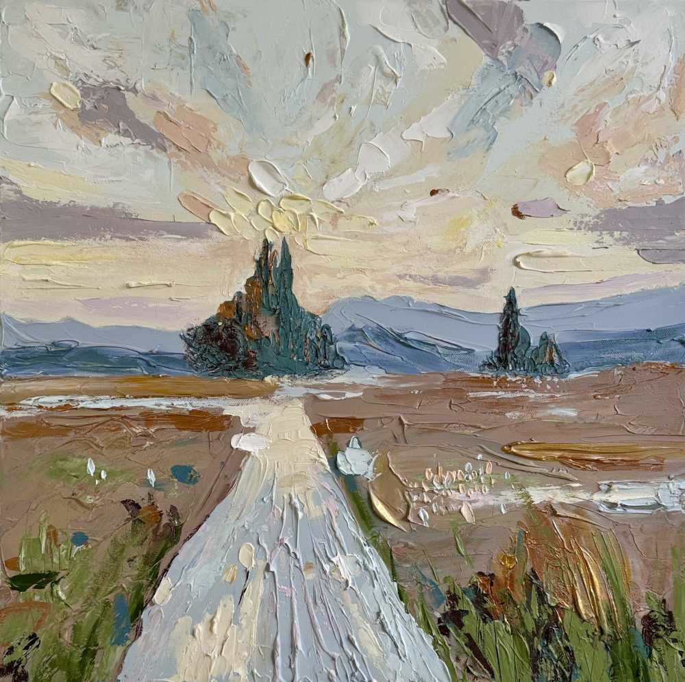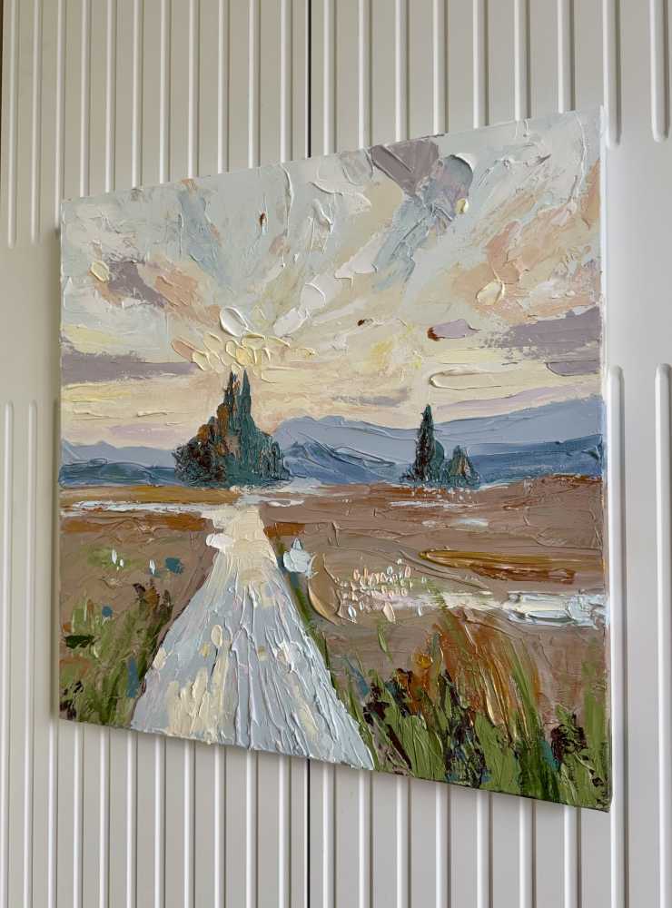 овых, голубых и пудровых оттенков создают ощущение рассеянного сияния и воздуха. На переднем плане свободные, почти импульсивные мазки трав и земли, написанные густо, с характерной объемной текстурой. Вдали силуэты деревьев, добавляющие глубину и уравновешивающие композицию. Работа передаёт ощущение пути, тишины и внутреннего равновесия - как момент, когда время замедляется, а пространство наполняется светом. Галерейный холст 60х60