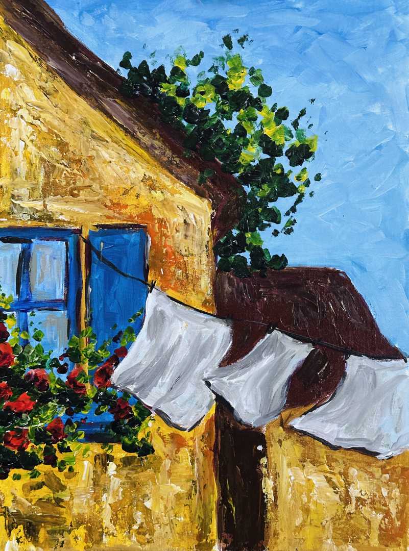 Перед вами не просто живописная работа, а приглашение замедлиться и почувствовать вкус жизни в её самых искренних проявлениях. В центре сюжета — мгновение абсолютного покоя: свежевыстиранное белье, трепещущее на веревке