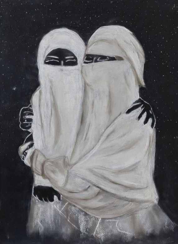 Только глаза и руки остаются открытыми — они говорят о поддержке и человеческом тепле, которое никакая ткань или тьма не способна скрыть. Картина — это нежное утверждение: даже в самых строгих рамках есть поддержка и связь