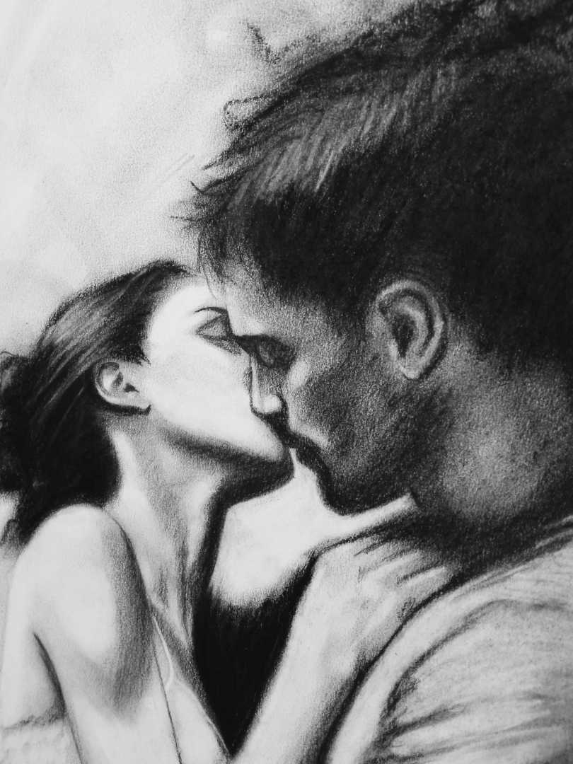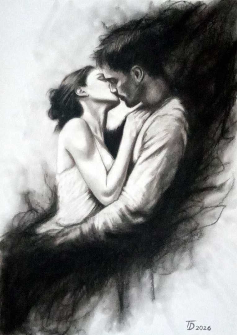 В этой работе я стараюсь показать не только физическую близость, но и глубокую эмоциональную связь, которая стирает границы между людьми. Фигуры влюбленных словно сливаются с окружающим пространством, создавая ощущение растворения в друг друге. Эта работа символизирует единение двух противоположност