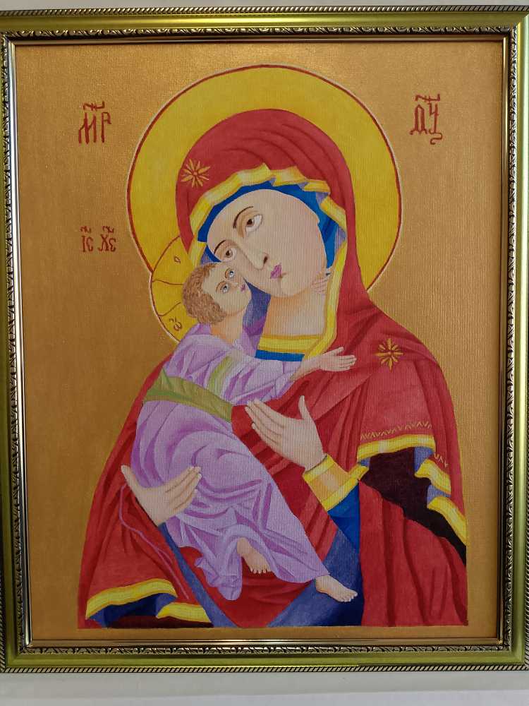 Икона написана маслом на холсте ( холст на картоне ) . Название иконы " Владимирская Божья матерь " . Икона написана по настоящим церковным прописям .
