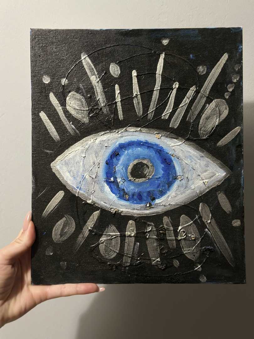 артина «Синий взгляд» — это символическая и эмоционально насыщенная работа, в центре которой образ глаза как знака осознанности, внутреннего наблюдения и скрытой силы. Контраст глубокого синего и чёрного фона усиливает ощущение концентрации и напряжённого диалога со зрителем.