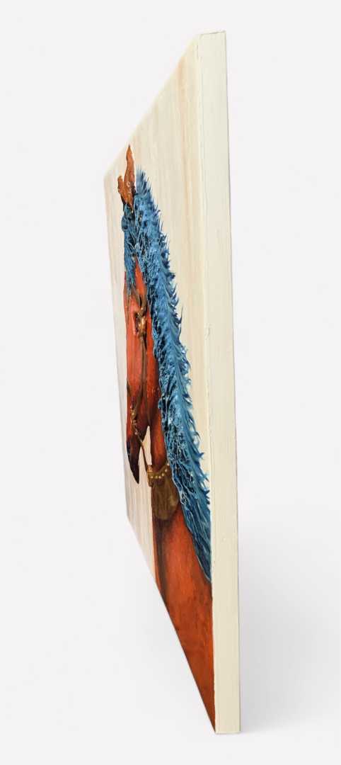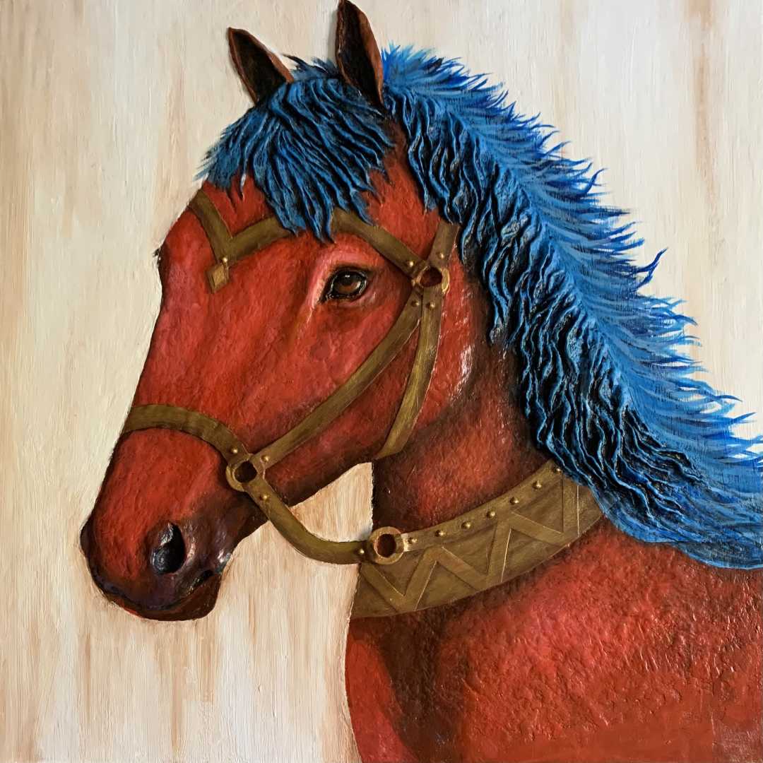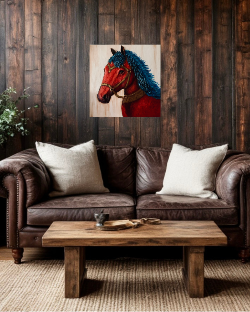 В этой уникальной картине, созданной с использованием папье-маше и эффектных цветов, раскрывается мифический образ лошади, символизирующий мощь и свободу. Контраст между огненно-красным телом и насыщенной синей гривой вызывает ощущение динамики и энергии. Золотистая уздечка с узорами добавляет благо