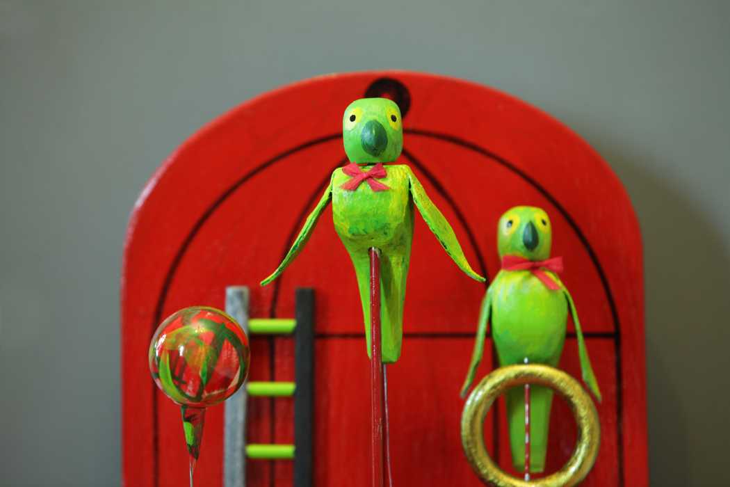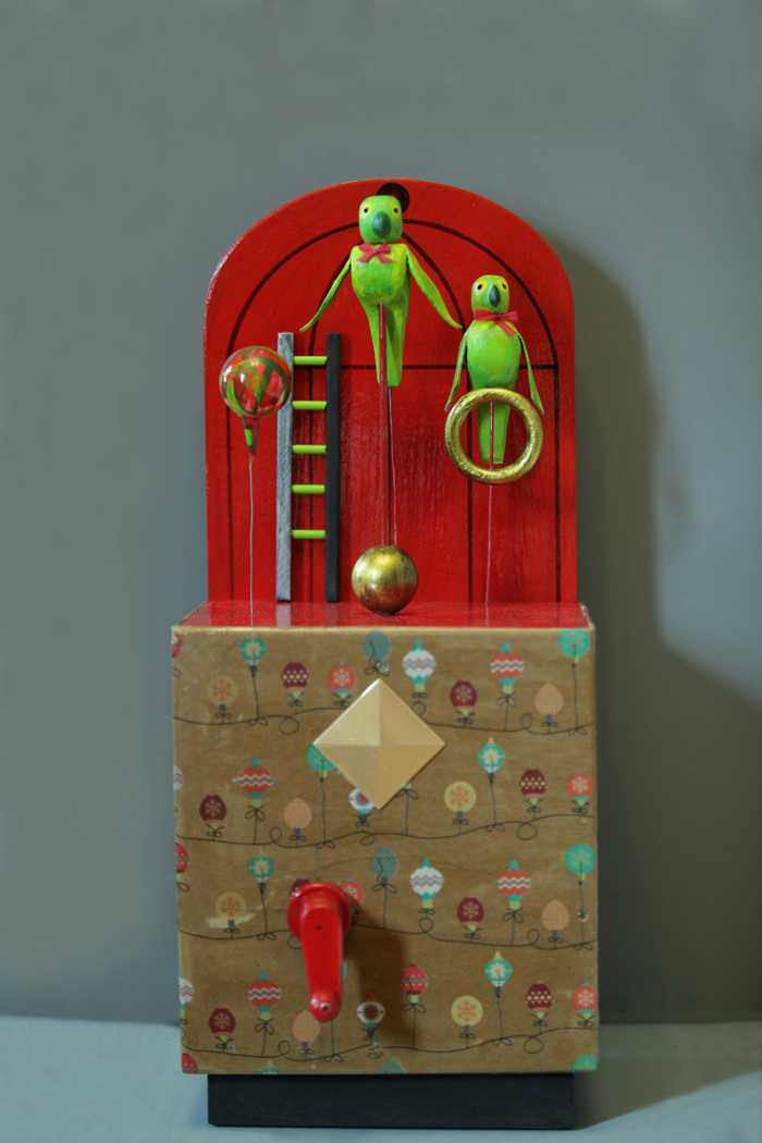Птицы сидят на шесте и кольце, раскачиваются, поворачиваю голову, машут крыльями, шарик подпрыгивает. В движение птицы приводятся вращением ручки на передней части автоматона. <