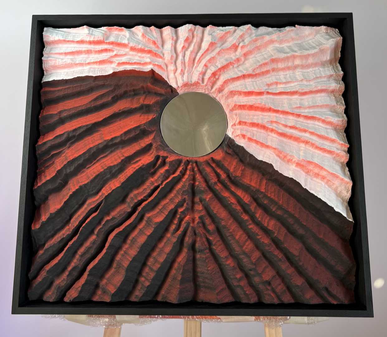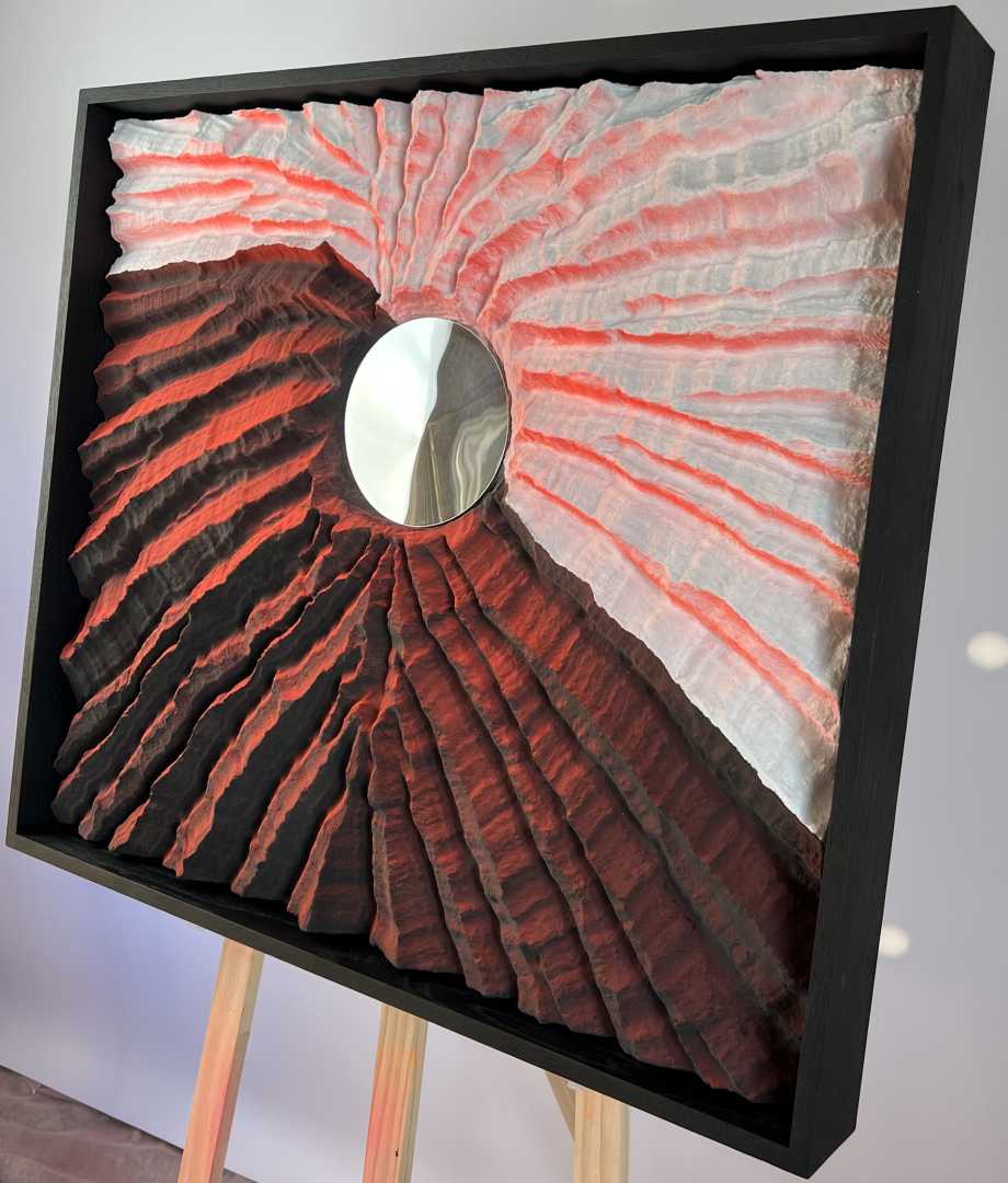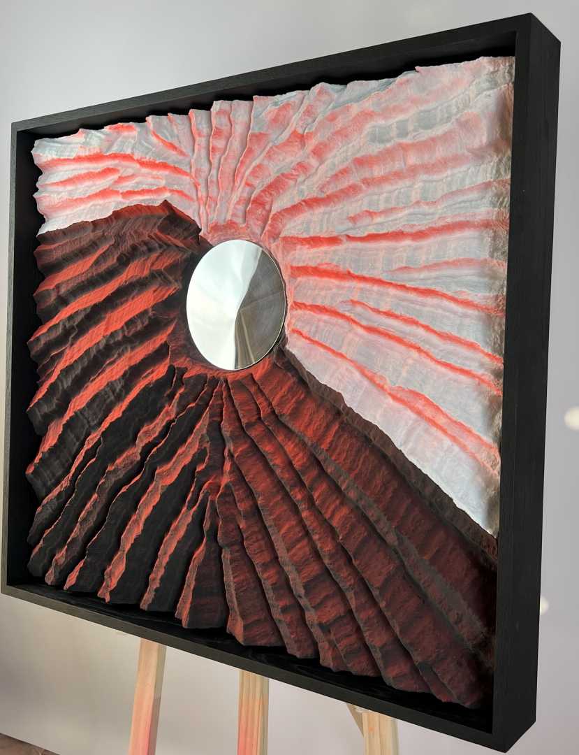 Динамичный симбиоз природных форм и индустриальной эстетики. Центральный зеркальный круг символизирует солнце, а рельефные текстуры и контрастные оттенки красного, черного и белого передают энергию. Работа балансирует между днем и ночью, светом и тенью, превращая отражение света в философский образ