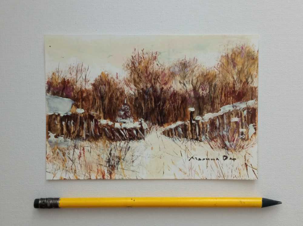 Небольшая атмосферная миниатюра, передающая тихий зимний вечер перед наступлением настоящих холодов. Заснеженная дорога между деревянными заборами уводит взгляд в глубину пейзажа, создавая ощущение уединения и спокойствия. Тёплая коричнево-охристая палитра смягчает зимний сюжет и делает работу особе