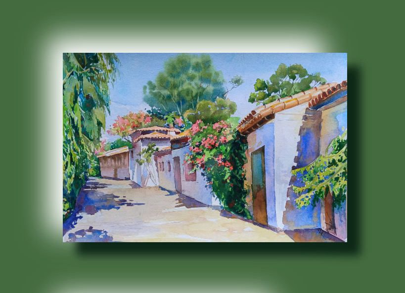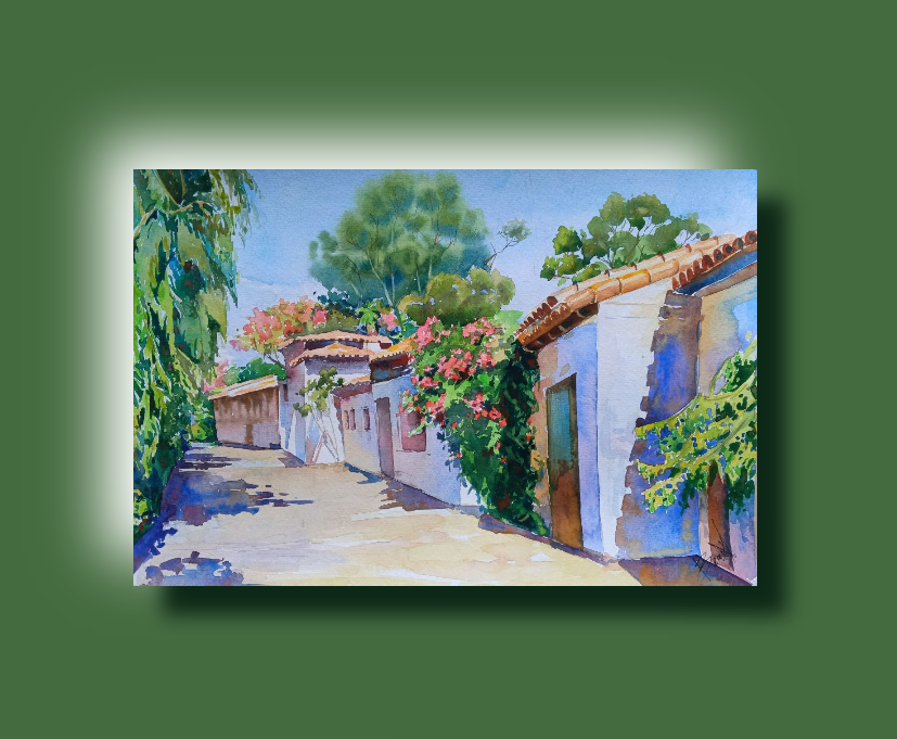 ь навсегда. Среди теней на дороге чувствуется играет легкий ветерок, принося запах свежей листвы и цветущих кустов. В этой тишине слышится шёпот природы, а насыщенные краски акварели пробуждают мечты о простых счастьях. Картина дарит забытое чувство гармонии и безмятежности, пробуждая в душе нежность к миру.
