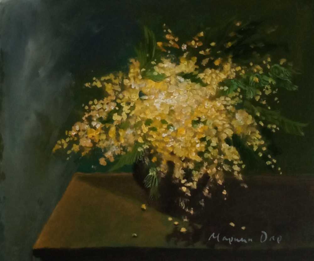 Небольшая картина с жёлтым букетом, наполненная атмосферой ожидания весны. Тёплые цветы контрастируют с глубоким зелёным фоном, создавая ощущение уюта и света.