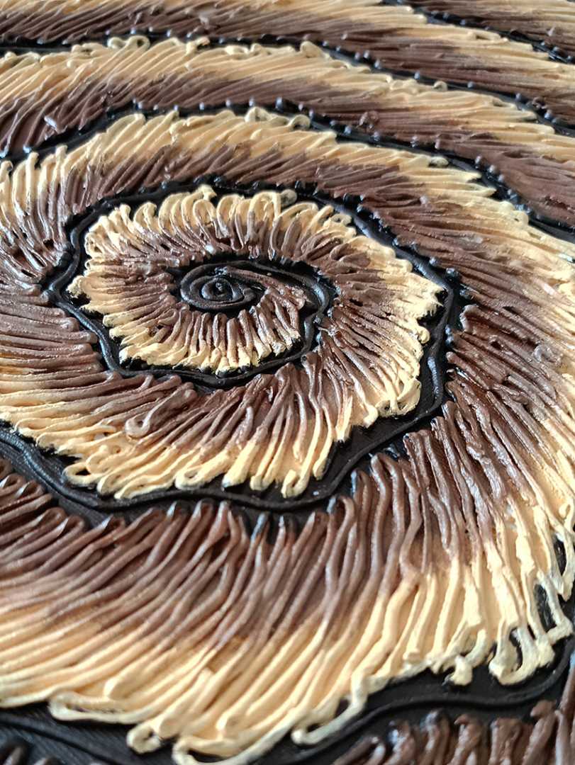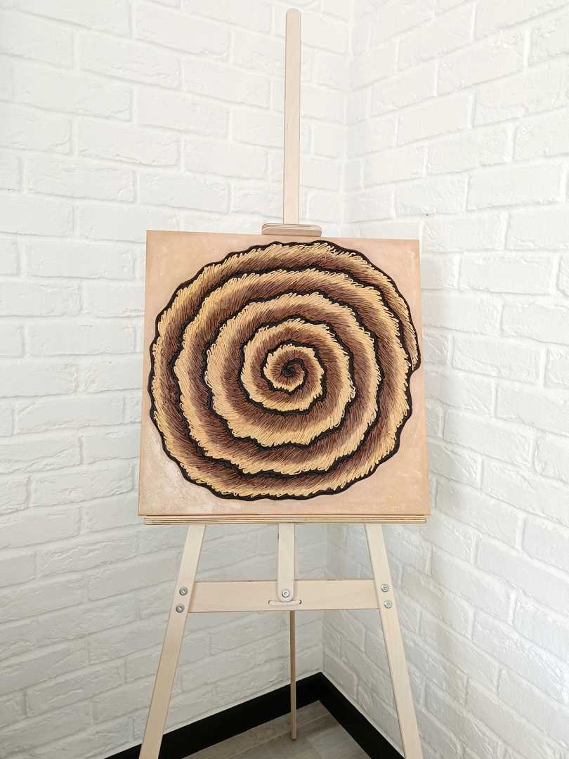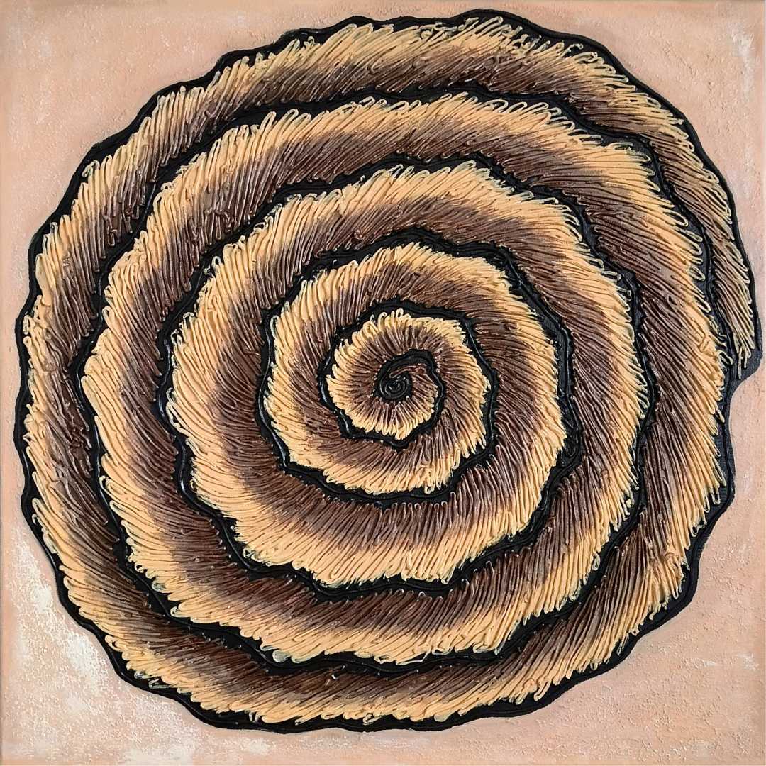 Картина представляет собой абстрактную спираль, выполненную в теплых песочных и коричневых тонах. Игра оттенков и плавные линии олицетворяют знойные африканские пейзажи, а текстура напоминает вид с высоты на крыши хижин местных жителей. Работа вызывает ассоциации с загадочностью и самобытностью Афри