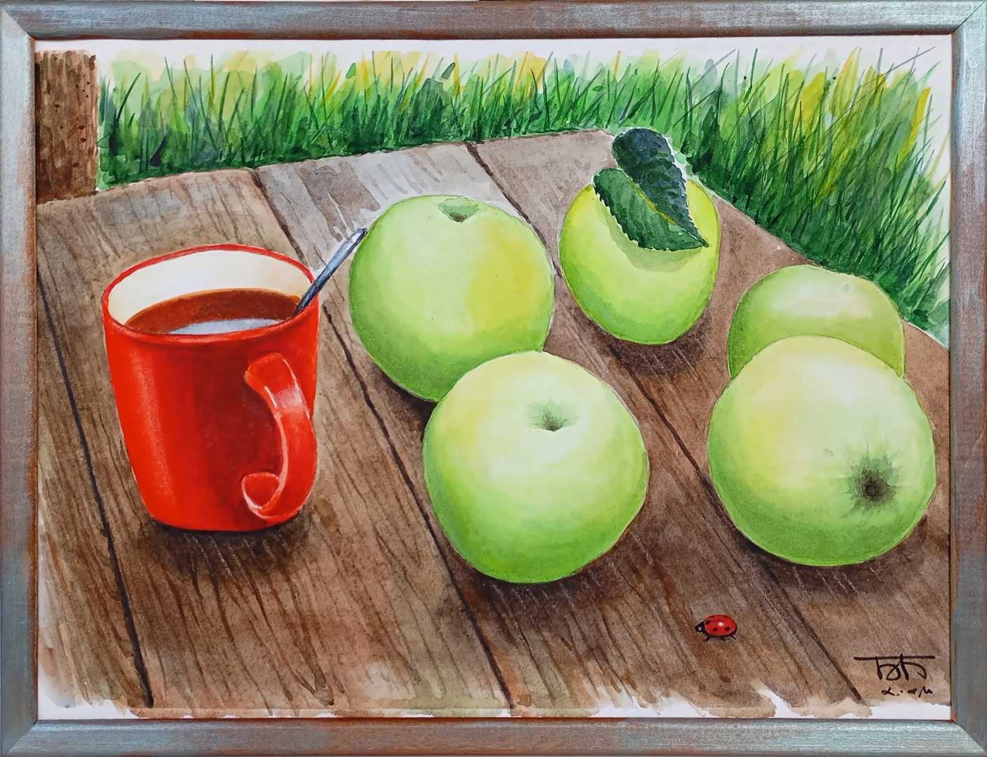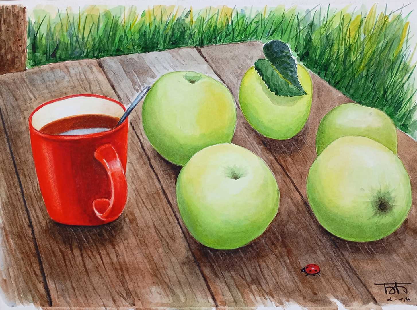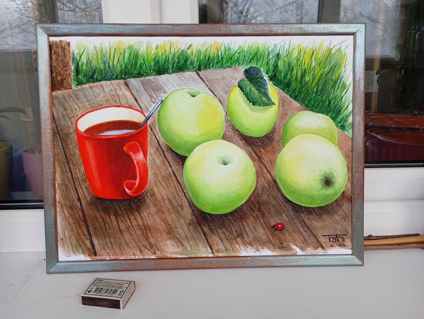 Антоновские яблоки и чай на столе в саду. Многослойная акварель. В раме