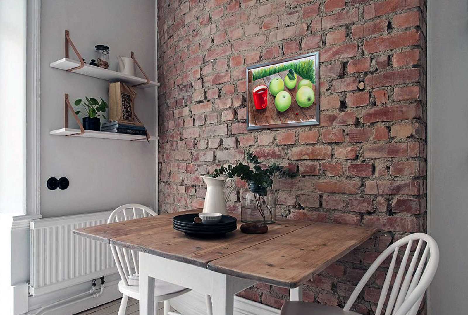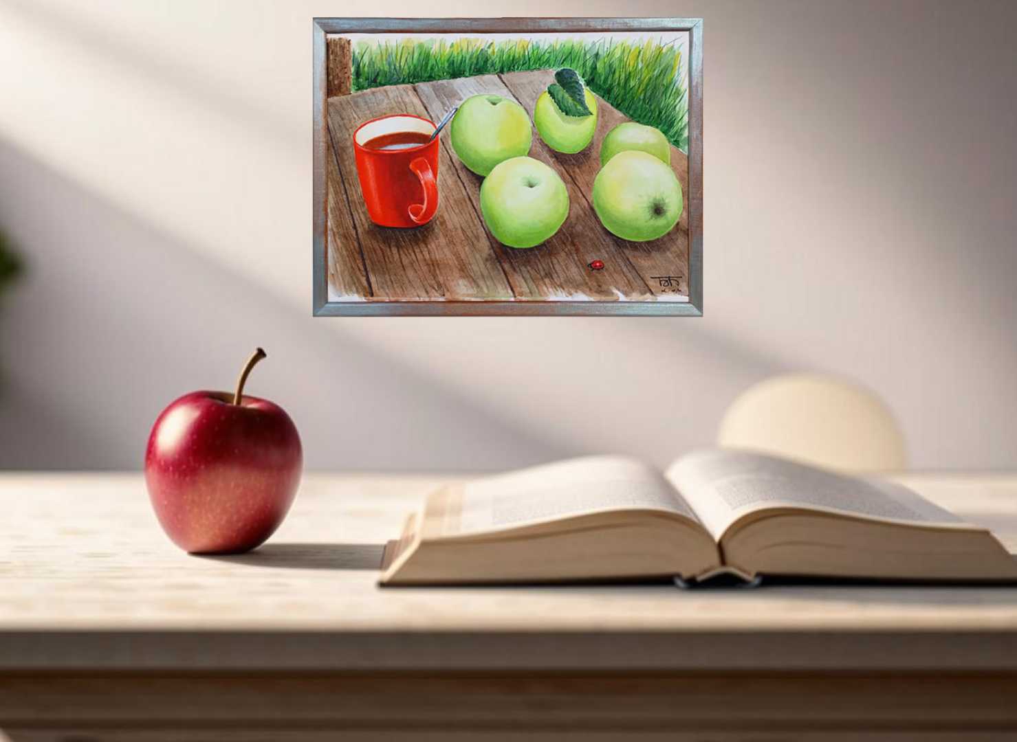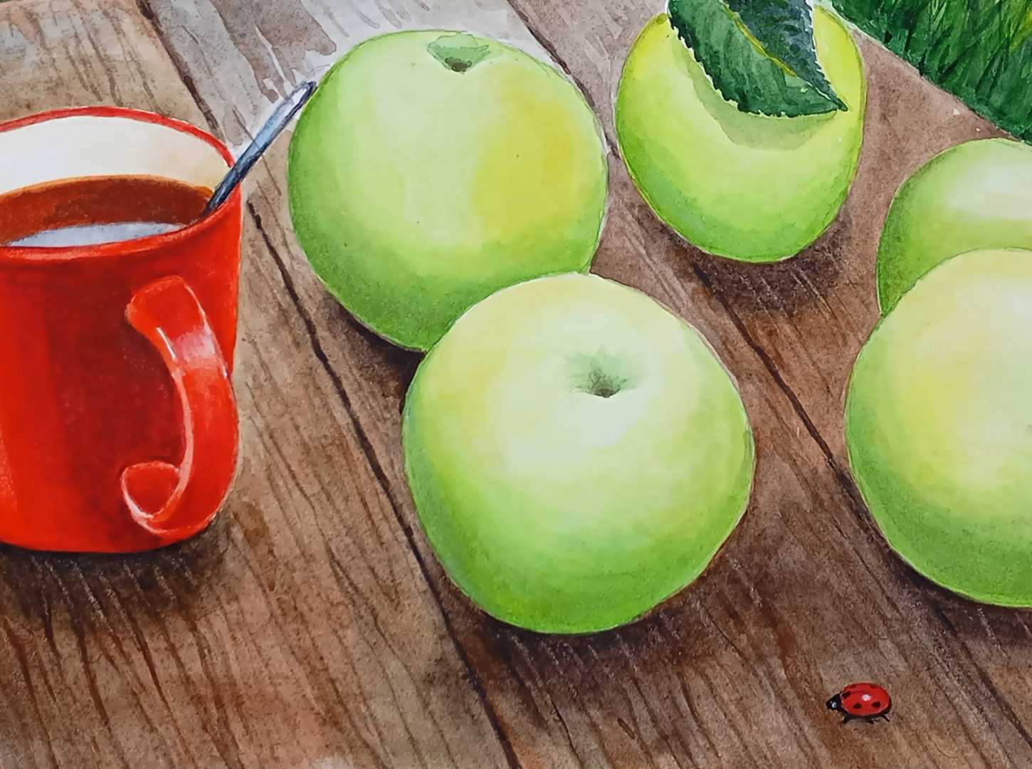 Антоновские яблоки и чай на столе в саду. Многослойная акварель. В раме