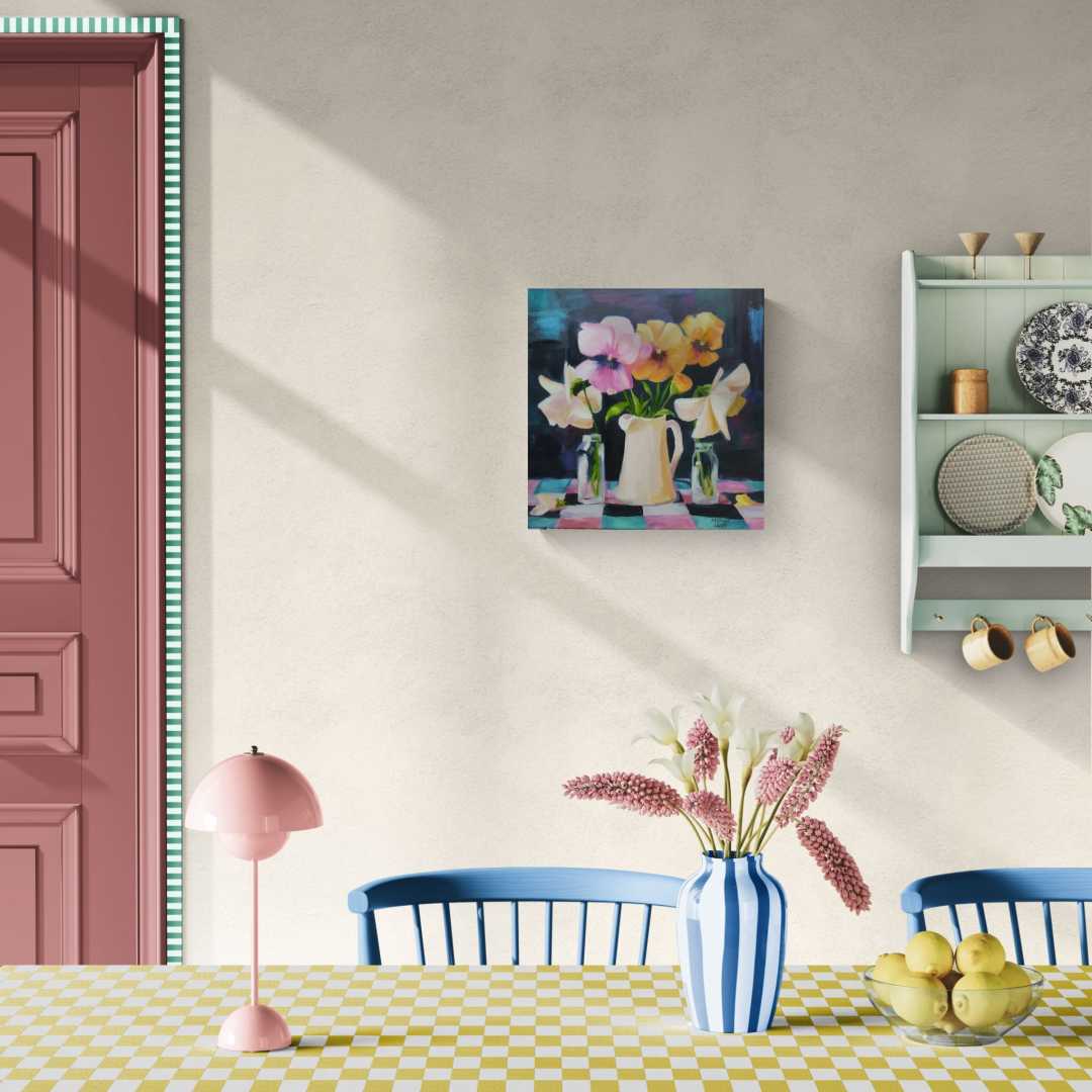Центром композиции стали яркие анютины глазки (виола) в светлом керамическом кувшине. Нежные оттенки розового, жёлтого и кремового цветов гармонично сочетаются с сочной зеленью стеблей. По бокам кувшина — стеклянные баночки с отдельными цветами, что добавляет композиции лёгкости и динамики.<