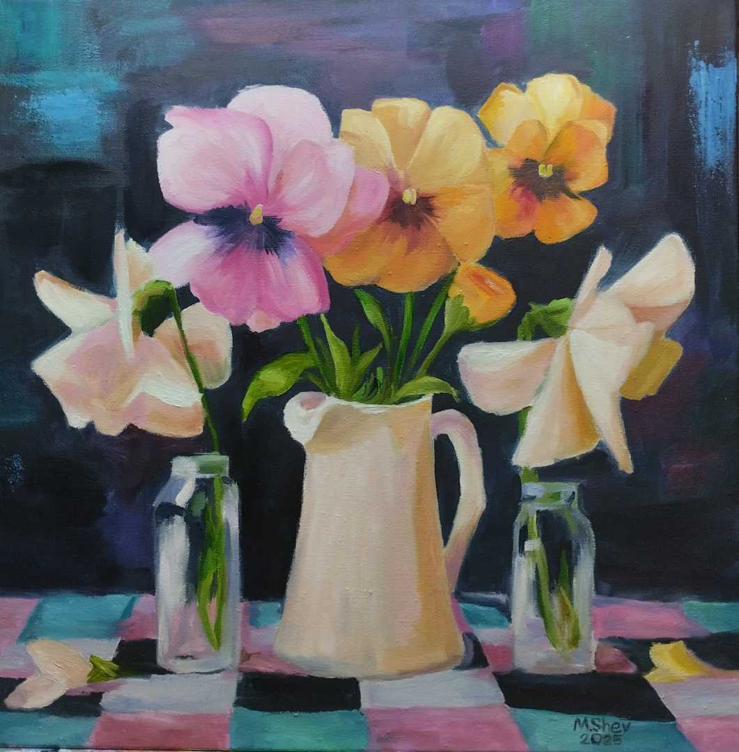 br /> Фон картины выполнен в глубоких, приглушённых тонах, которые подчёркивают яркость цветочной композиции. Скатерть с клетчатым узором в пастельных оттенках создаёт ощущение тепла и домашнего уюта. Эта работа идеально подойдёт для украшения интерьера — привнесёт в пространство нотку весенней свежести и художественной изысканности.