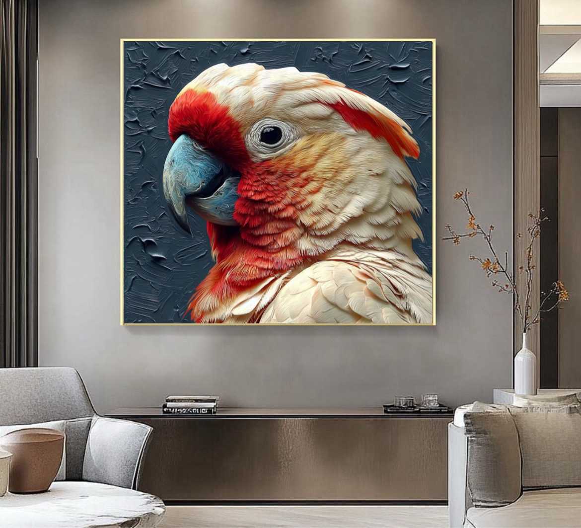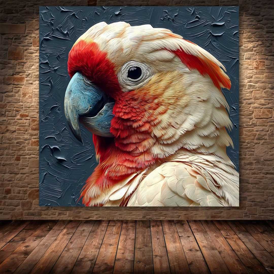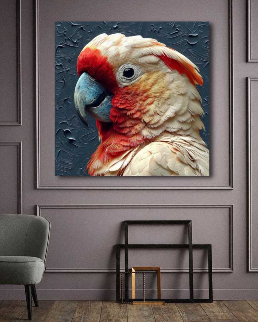 Современная картина изображает великолепного попугая-краснокрылого ара с яркими перьями и глубоким взором. Фон выполнен с текстурными мазками, создающими ощущение динамики и движения, подчеркивая экзотическую красоту и дикость этого тропиче