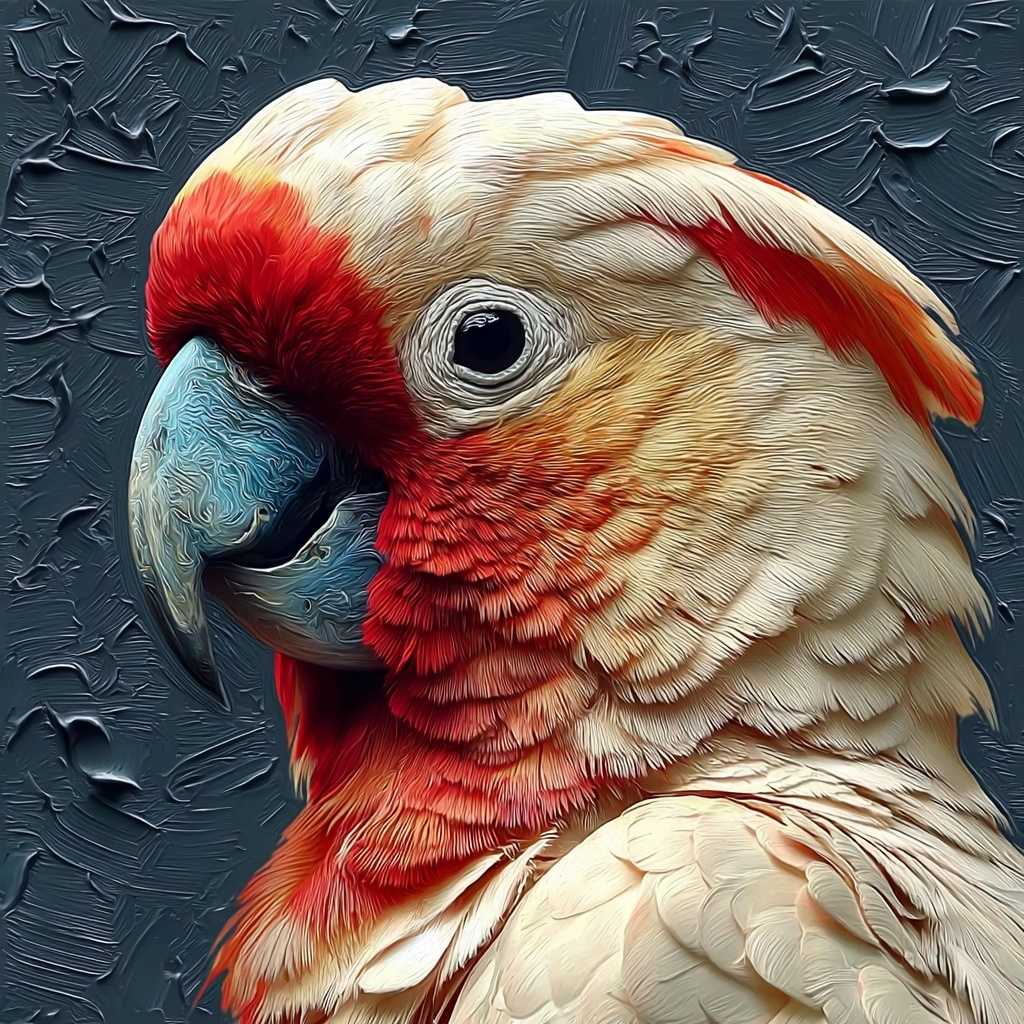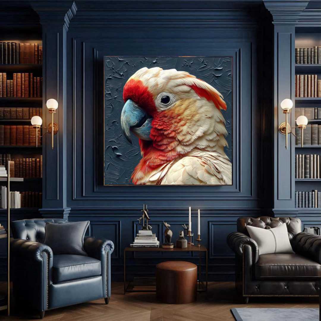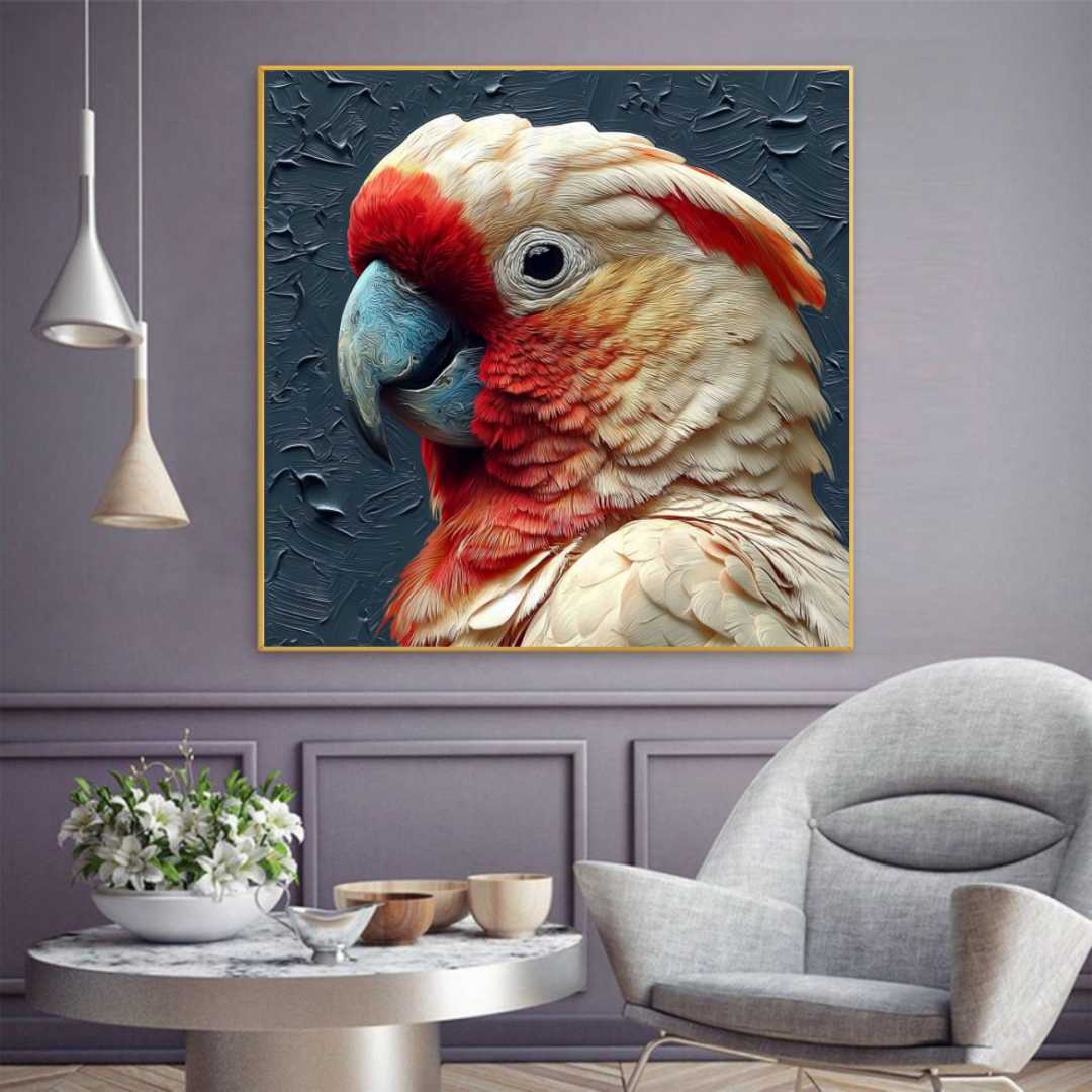 Современная картина изображает великолепного попугая-краснокрылого ара с яркими перьями и глубоким взором. Фон выполнен с текстурными мазками, создающими ощущение динамики и движения, подчеркивая экзотическую красоту и дикость этого тропиче