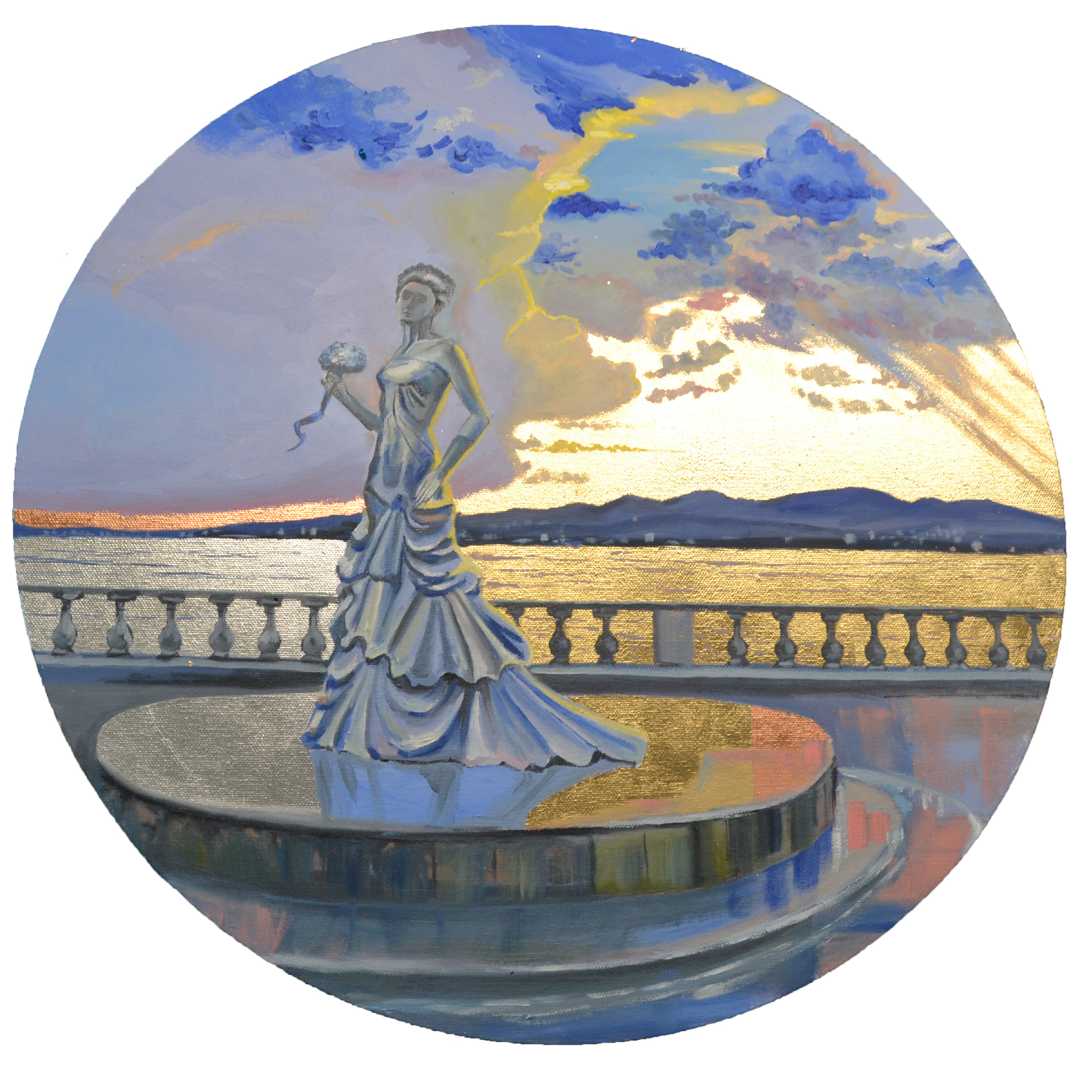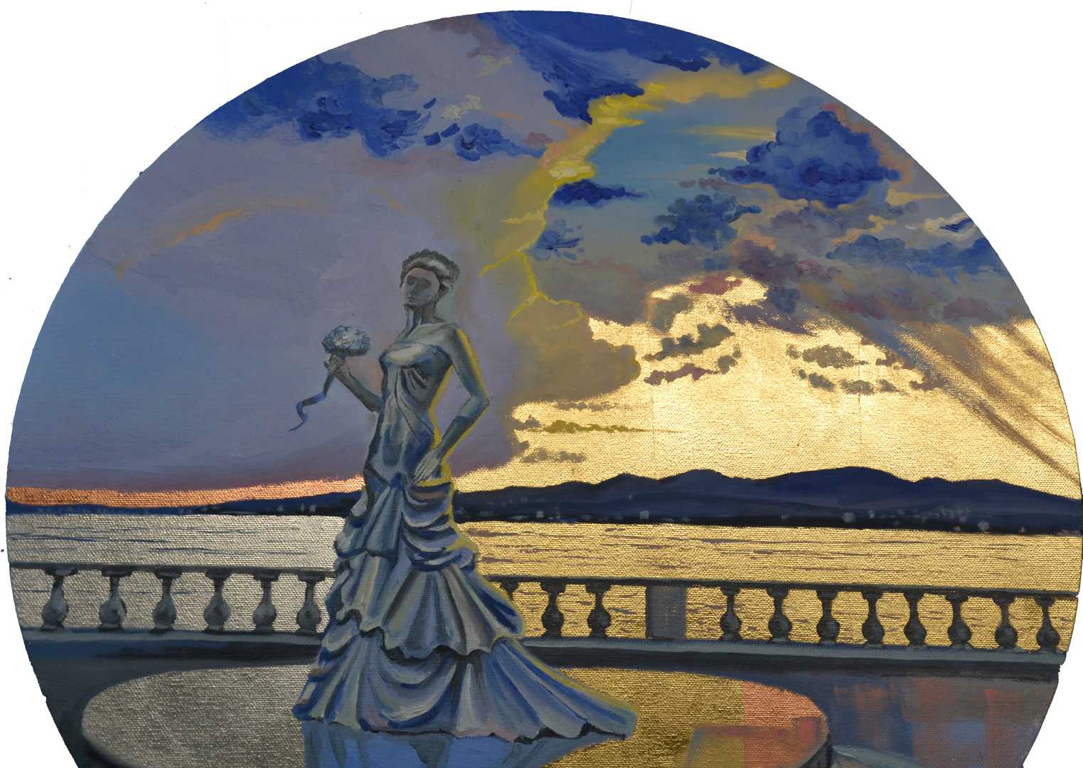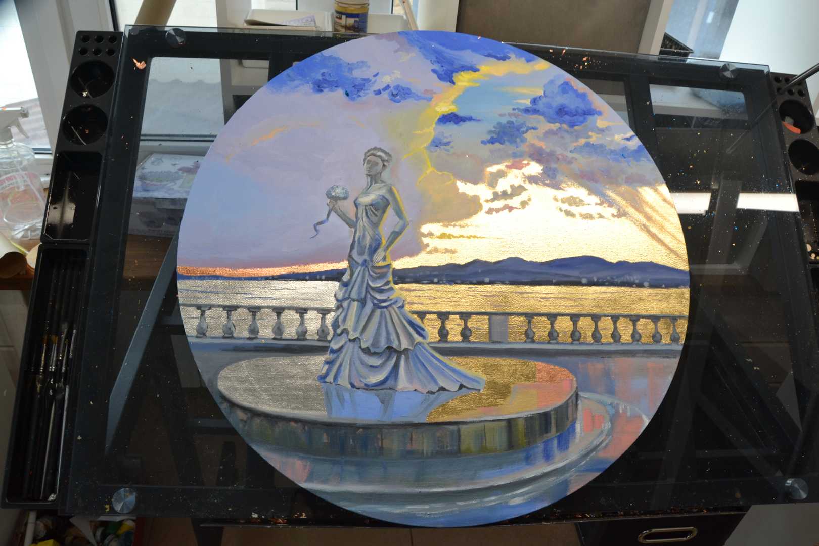 Работа выполнена на холсте на подрамнике масляными красками с технологией применения листовой потали. Размер 60Х60 см. На работе изображена достопримечательность города Геленджика - Белая невеста.