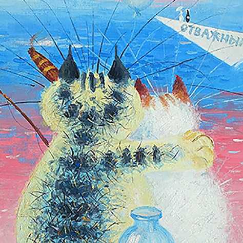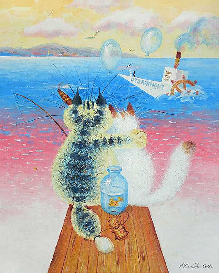 Картина «Белый пароход» — это светлая и сказочная работа. Два кота, сидящие у воды и обнявшиеся, смотрят вслед уходящему паро