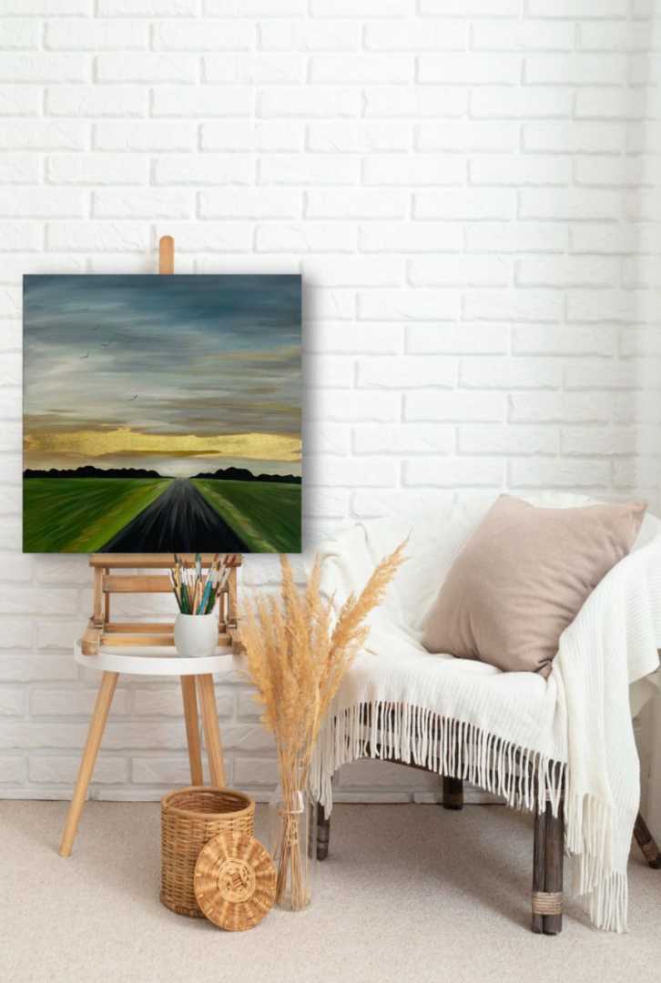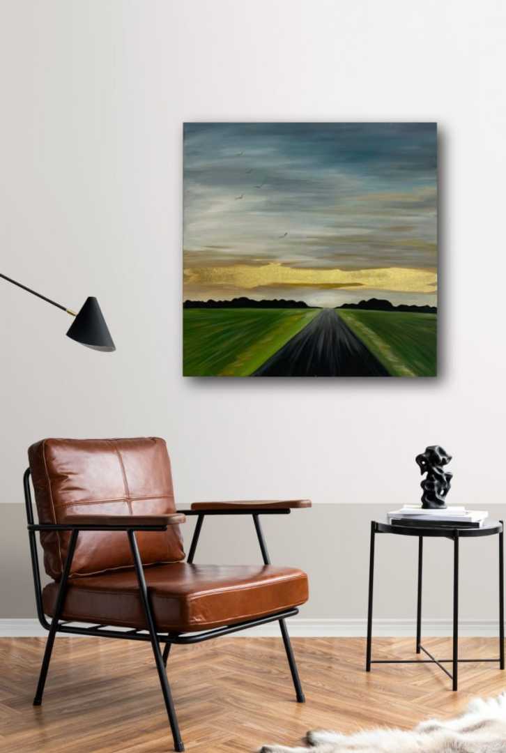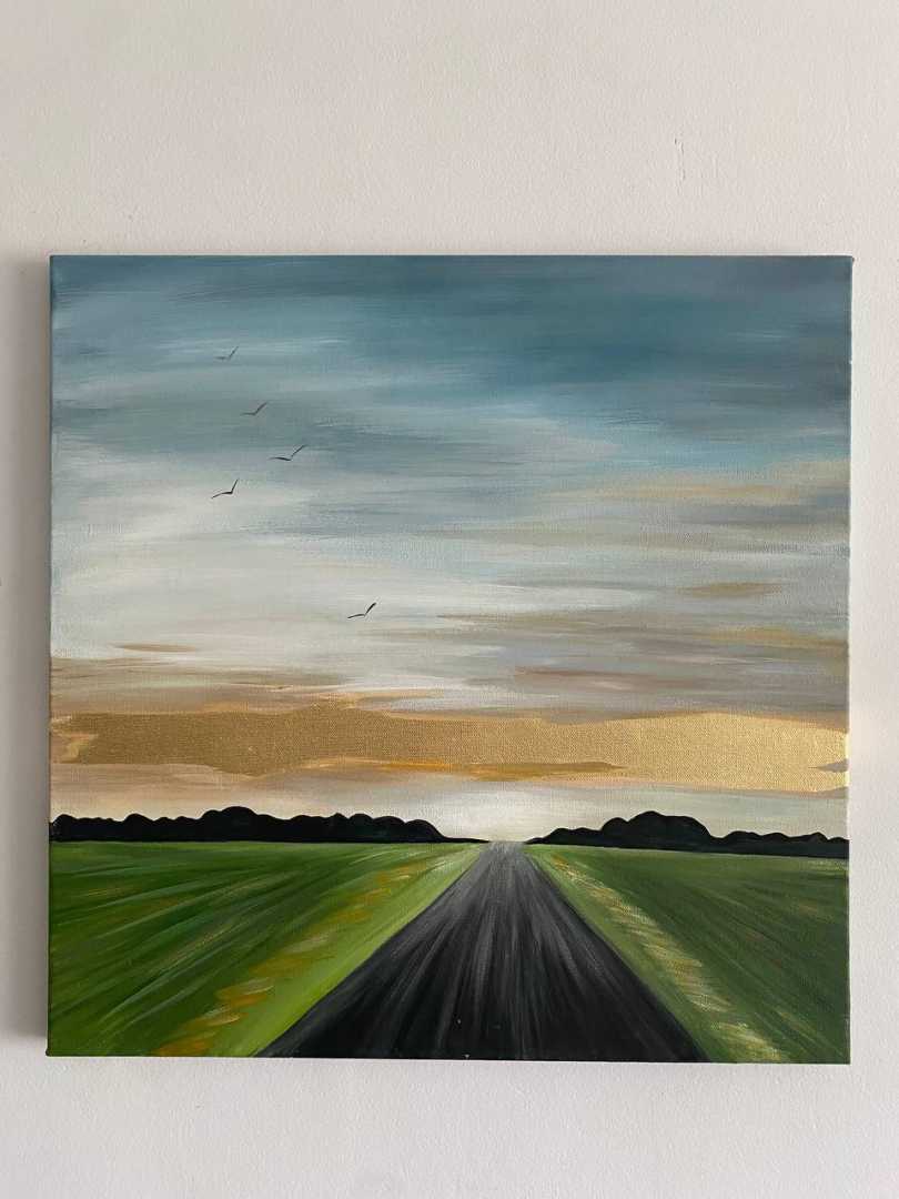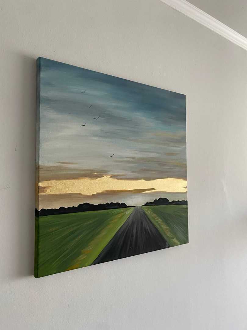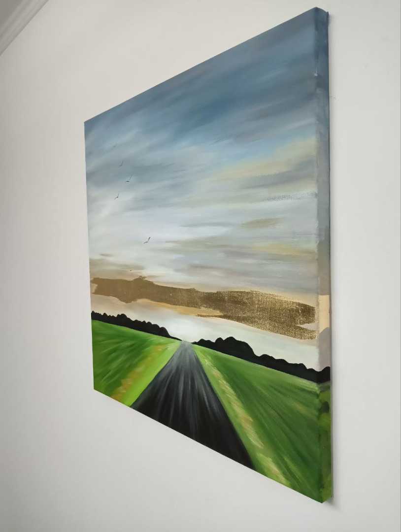 Широкое поле, уходящая вдаль дорога и небо с мягкими облаками — картина создаёт ощущение бескрайнего спокойствия. Золотая полоса над горизонтом тольео подчеркивант его. Зелёные поля, тёмный асфальт, золотистый отблеск за