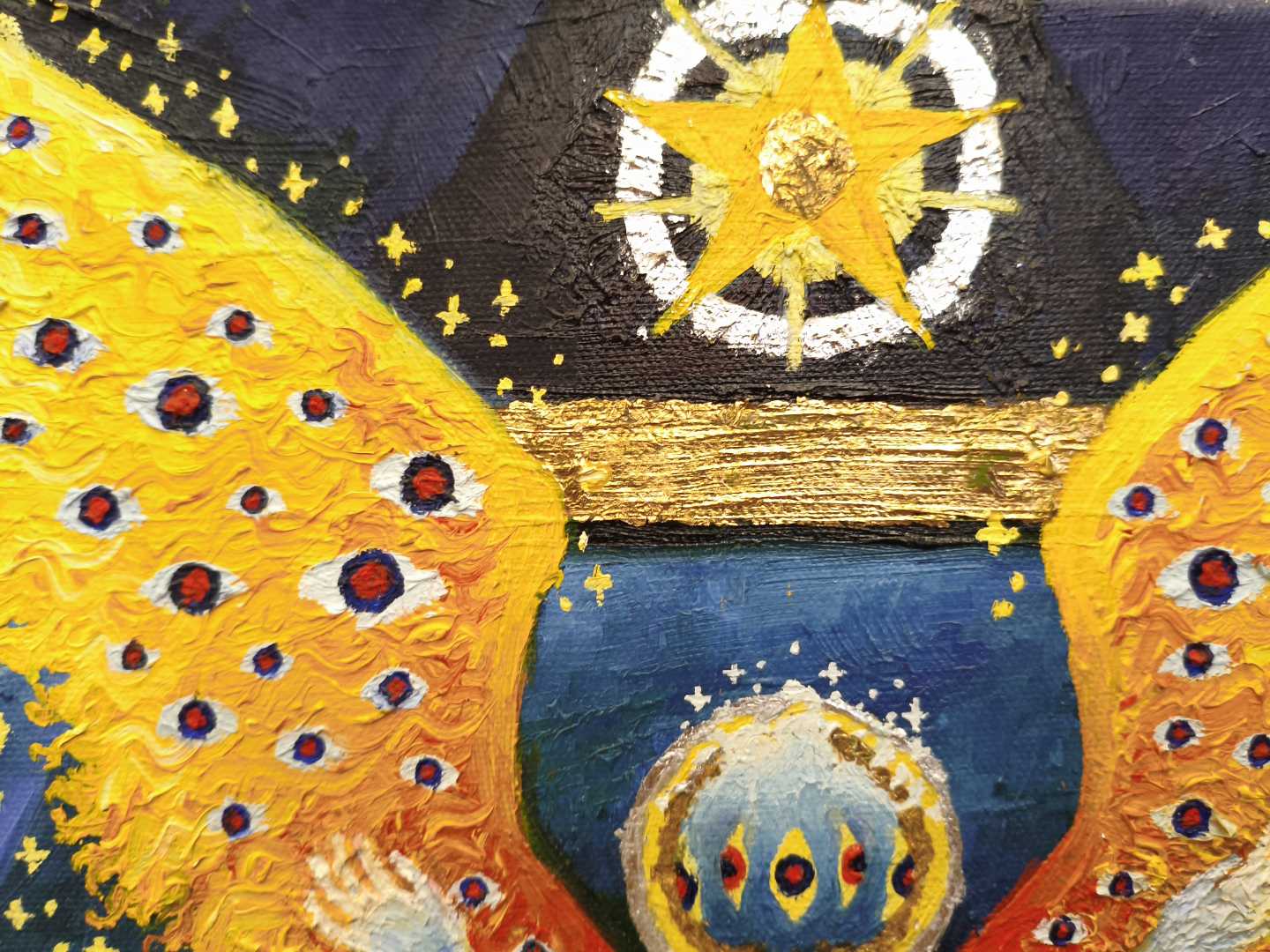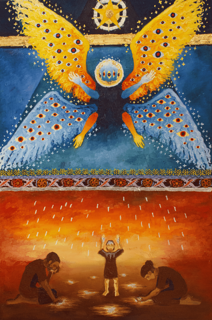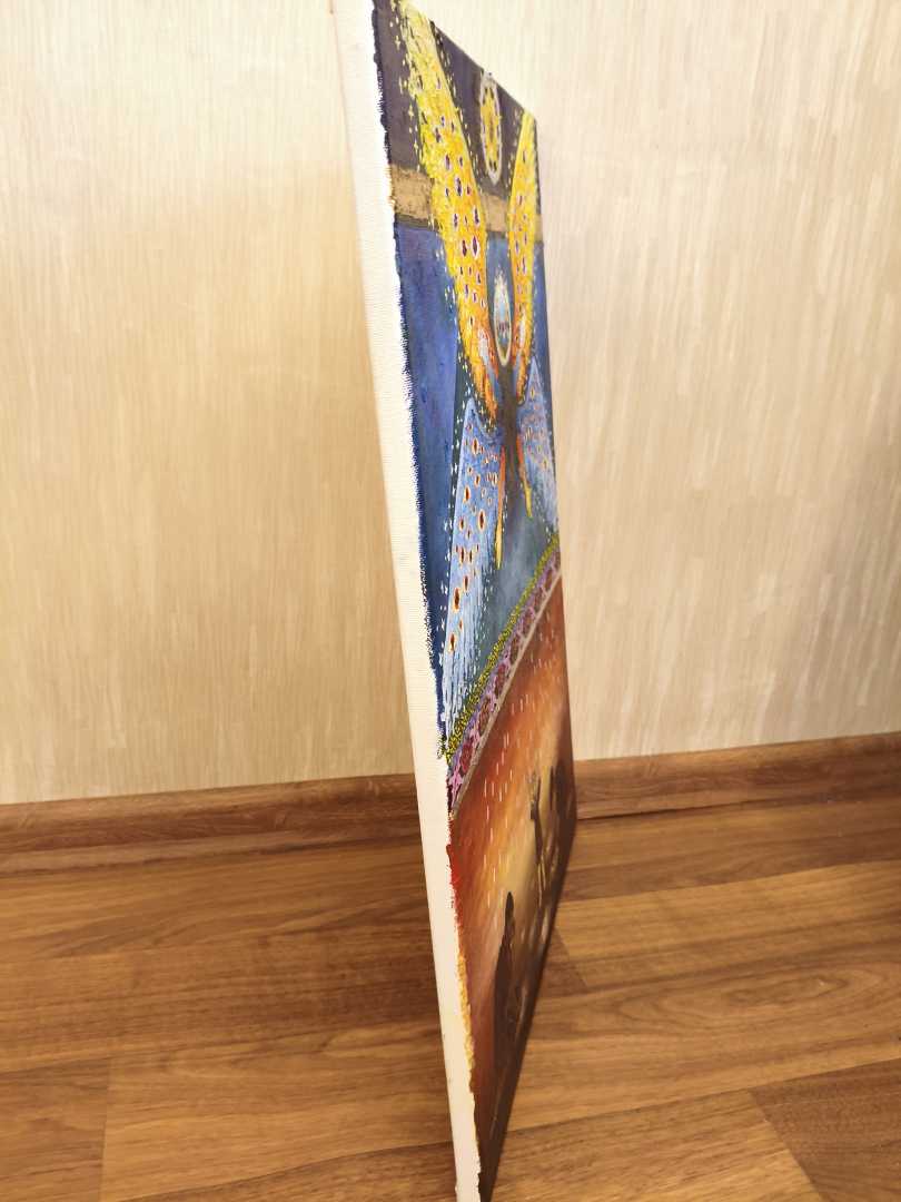Эта картина - переложение библейских мотивов на современный лад, мое восприятие византийской иконописи. Картины яркая и абстрактная, но в то же время выдержана в строгих тонах. Элегантно впишется в любой интерьер.