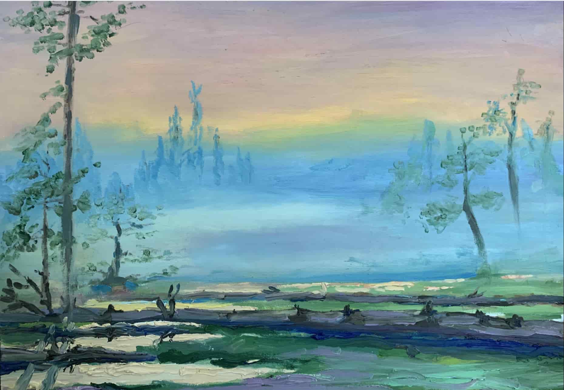 Необычный пейзаж — на картине изображено болото в сумерках с плавным переходом цветов на горизонте.