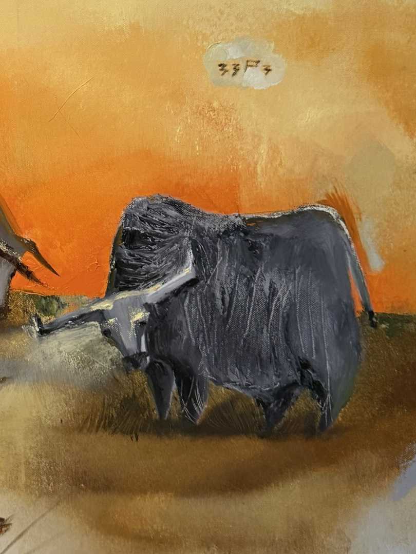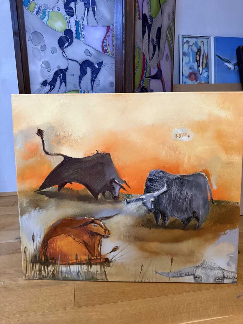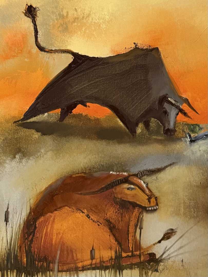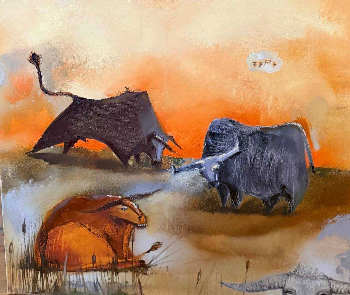 Выразительная авторская картина, наполненная внутренней силой, напряжением и характером. Три быка, объединённые в едином пространстве, создают динамичную композицию, в которой ощущается энергия движения и скрытая мощь.