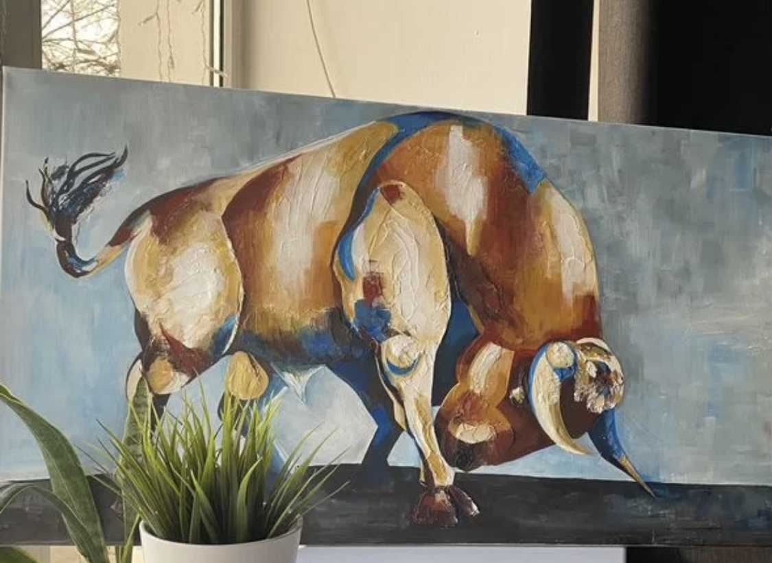 Эта картина сразу притягивает взгляд и буквально дышит силой. Она выполнена акрилом с текстурной пастой, благодаря чему поверхность становится объёмной, рельефной и живой — свет скользит по мазкам, подчёркивая мощь формы и энергию движения.