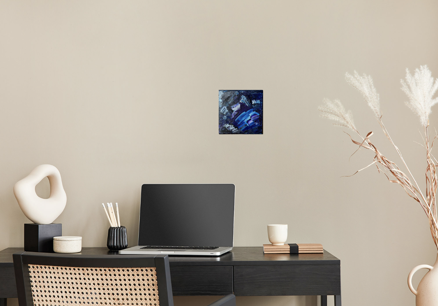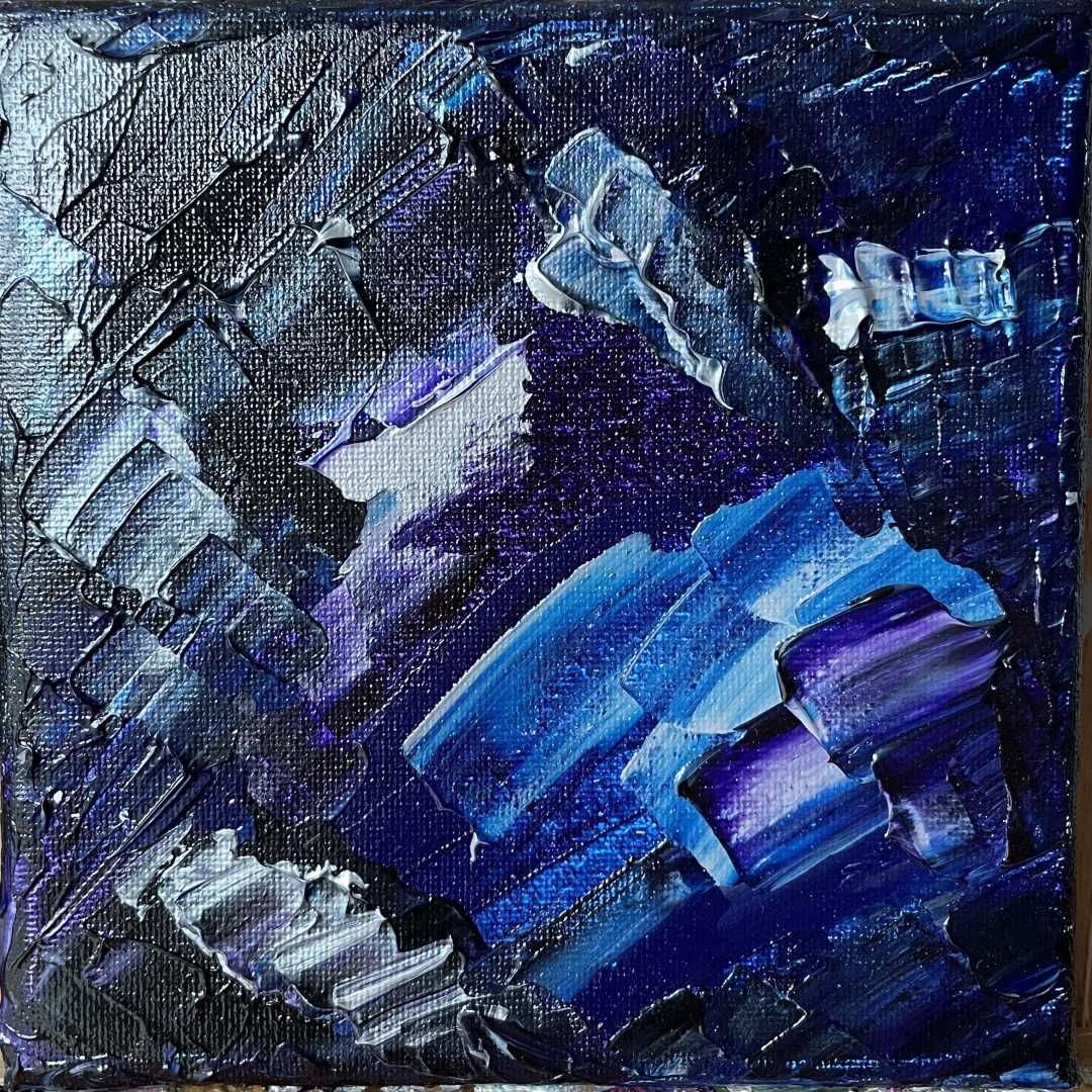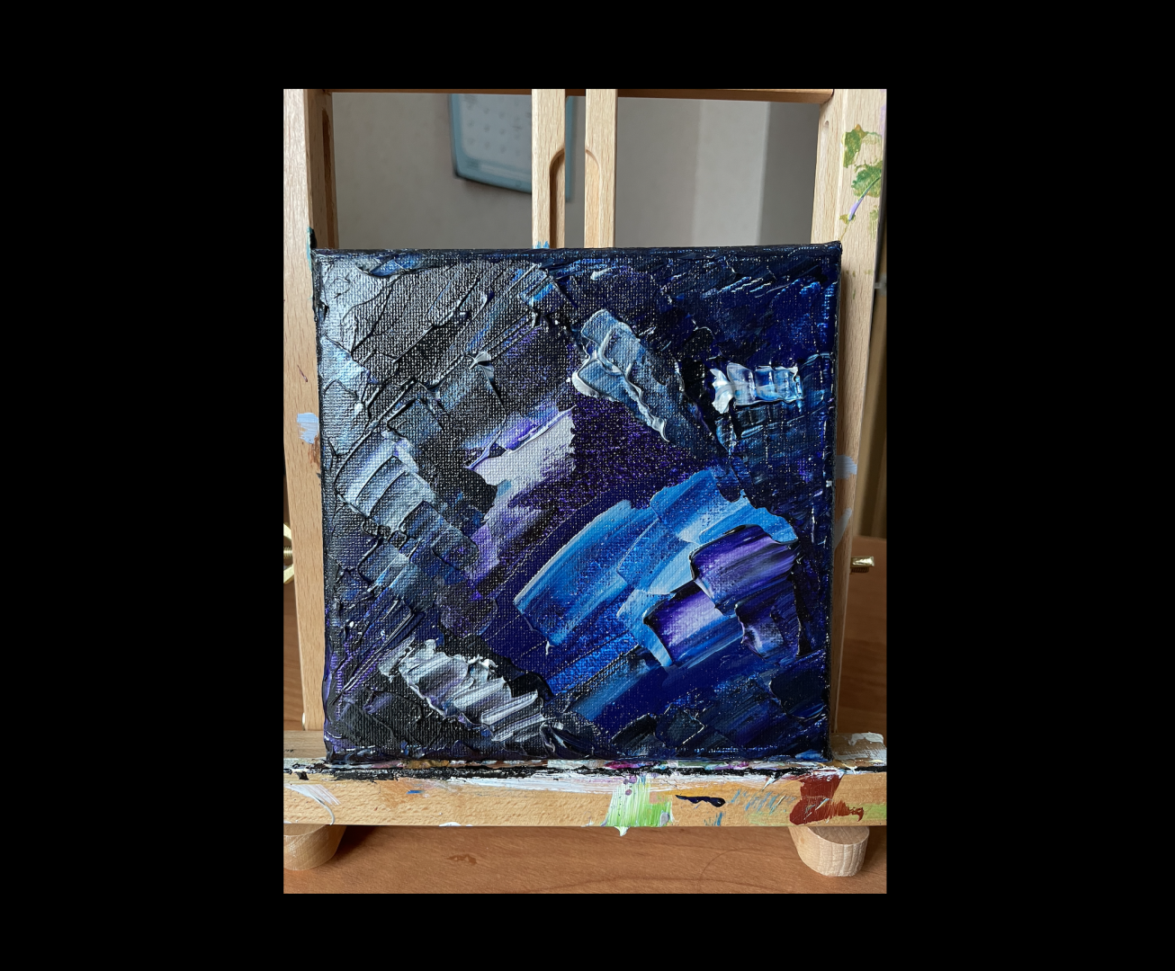 Абстрактная картина, выполненная в глубокой палитре синих и фиолетовых оттенков, символизирует внутренний мир человека — многослойный, противоречивый и бесконечно глубокий. Фактурная поверхность и игра света создают ощущение движения энергии и эмоций. Работа передаёт состояние размышления, поиска се