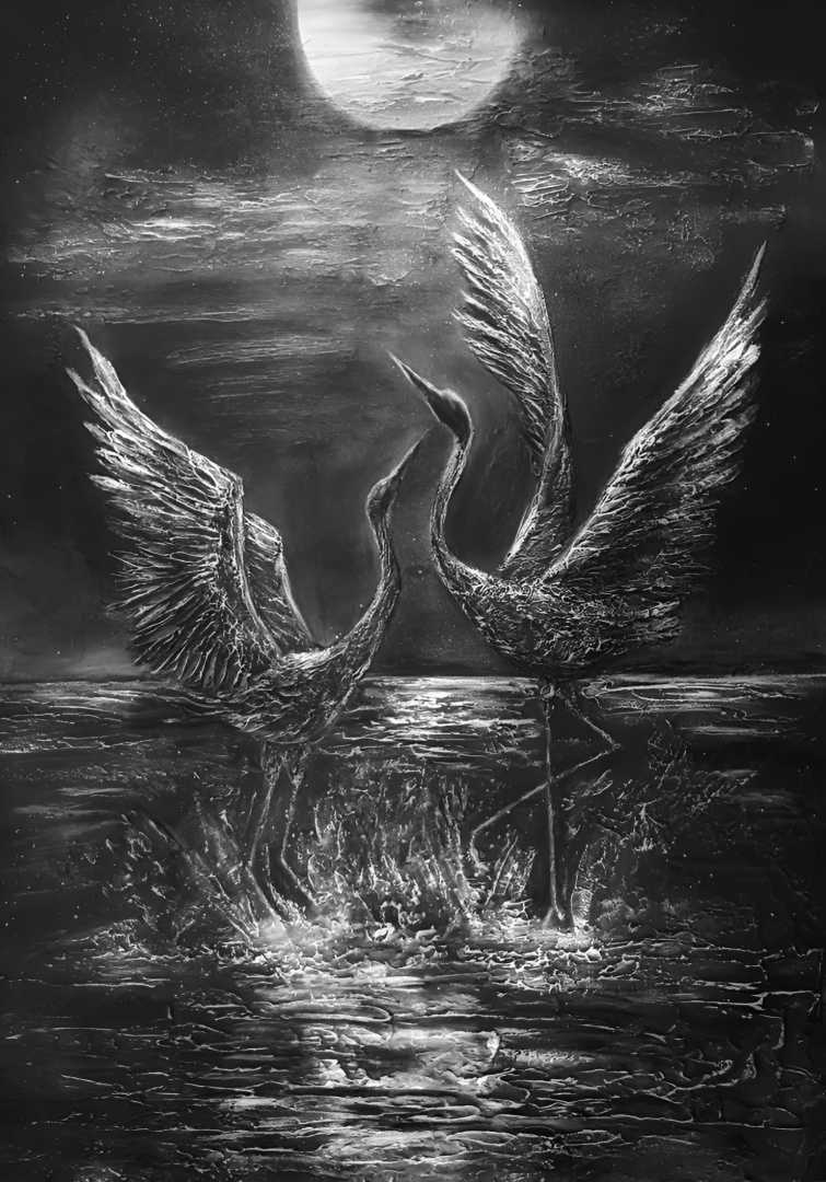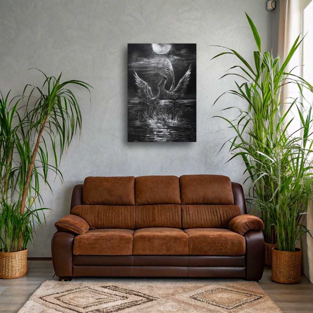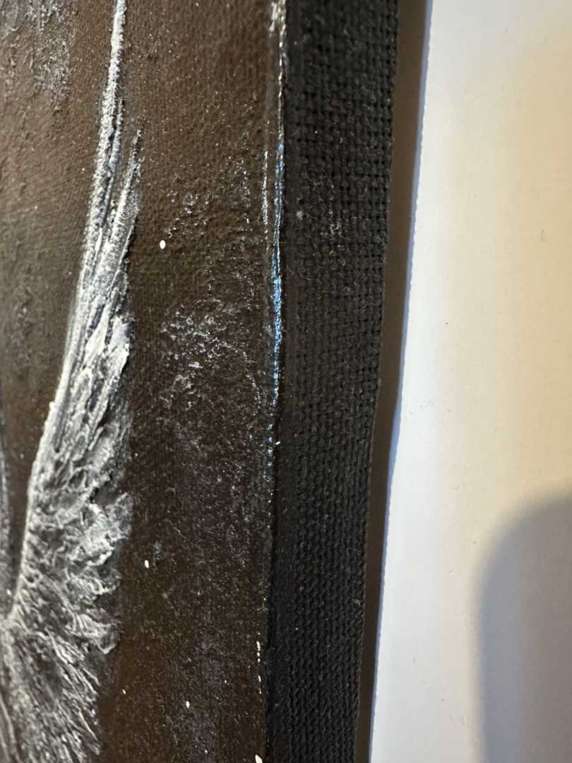 Черно-белая монохромная работа, выполненная в технике фактурной живописи акриловыми красками,покрыта лаком для лучшей сохранности. Торцы прокрашены. Шнур для подвеса прикреплен к картине,можно сразу вешать на стену.