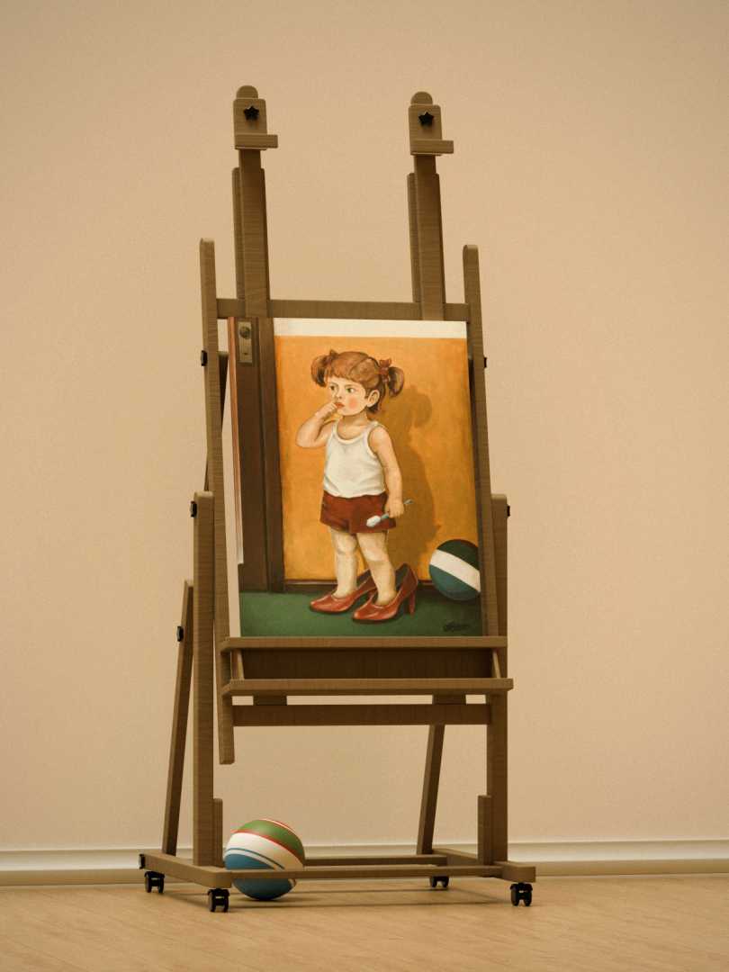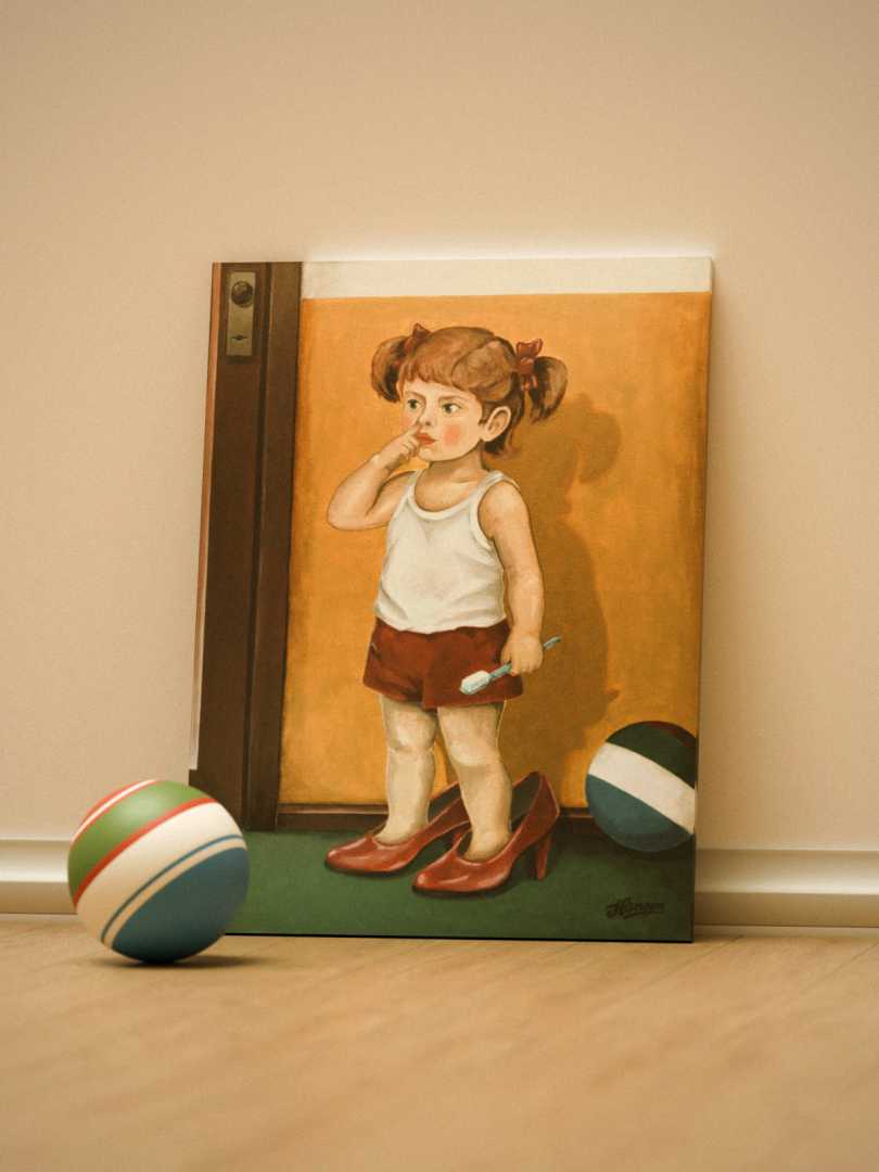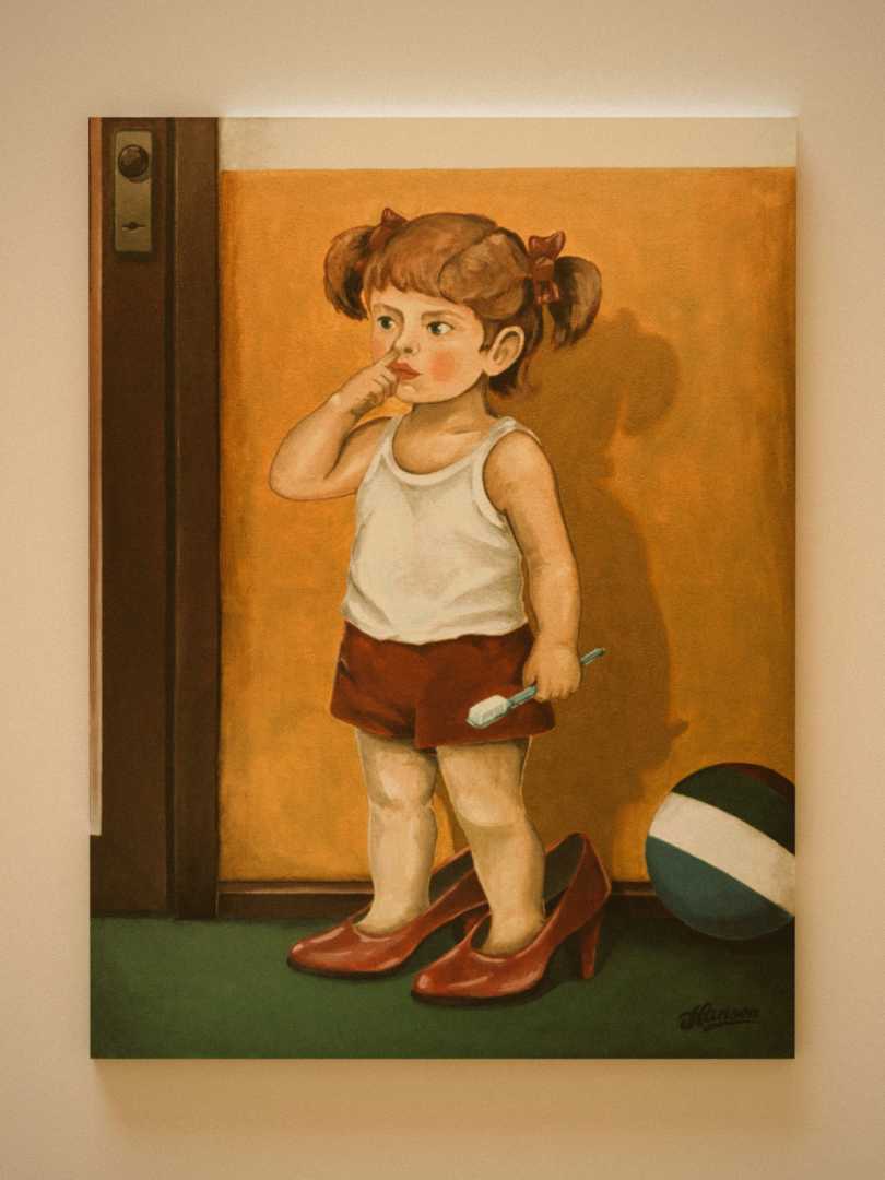 Картина представляет собой тёплую семейную сцену, наполненную детским любопытством. В центре композиции маленькая девочка, стоящая в больших маменьких туфлях. Её взгляд сосредоточенно направлен внутрь себя, ведь одной рукой малышка увлечённо исследует содержимое собственного носа, изучая мир изнутри
