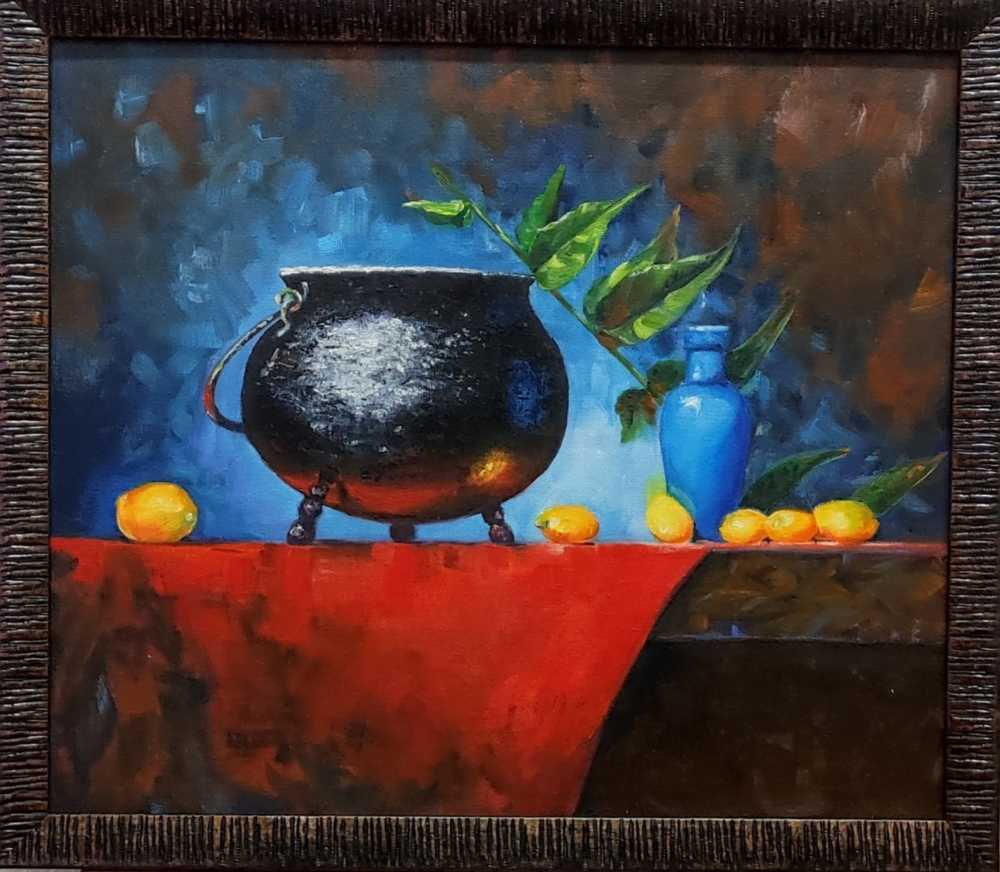 Чугунный котелок с лимонами (вольная копия Д. Чейфица). Современная картина в ярких, броских сочетаниях цветов, с игрой контрастов и глубокой насыщенностью. Этот натюрморт просто светится, наполненный магией и волшебством.