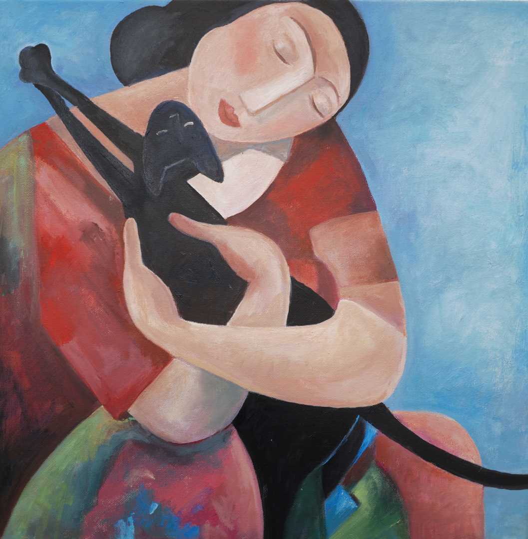 Выразительная декоративная работа, передающая нежность и глубокую эмоциональную связь. Девушка бережно прижимает к себе кошку — композиция наполнена теплом, доверием и спокойствием.