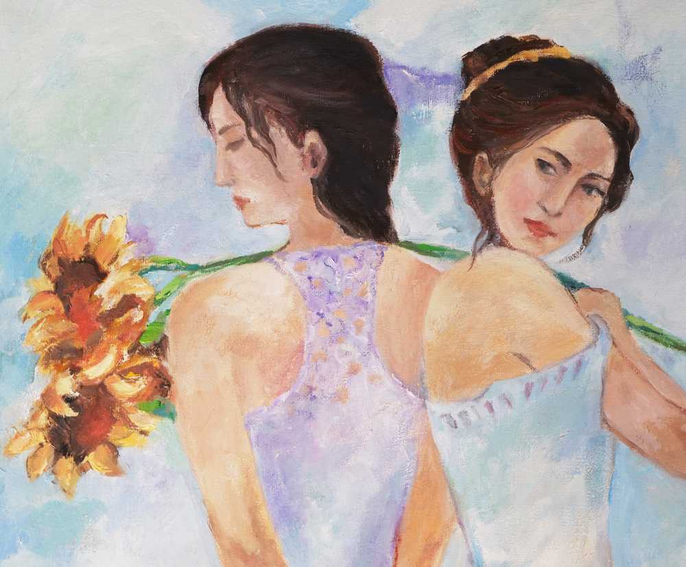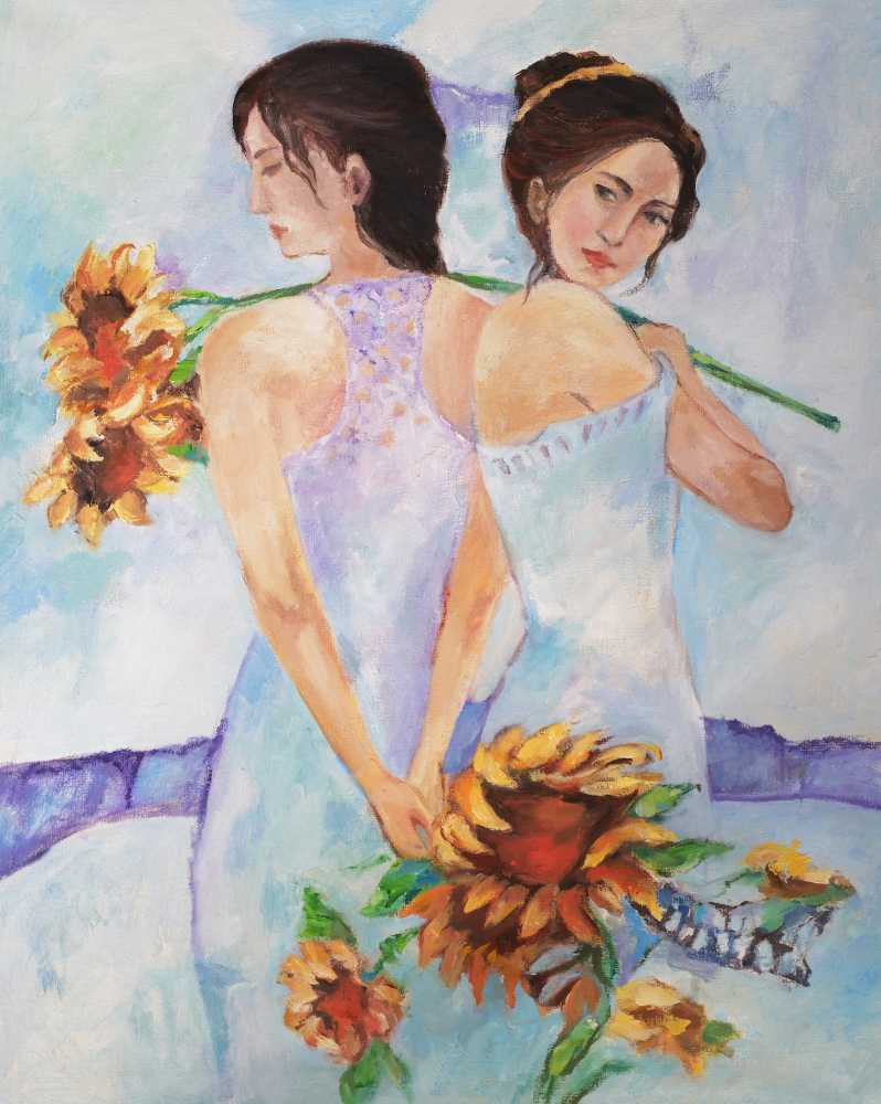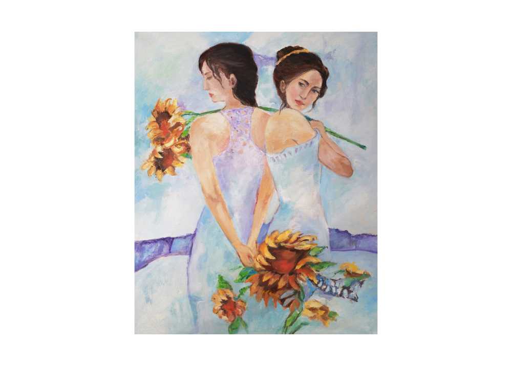 Лёгкая и светлая композиция, в которой два женских образа окружены яркими подсолнухами. Картина наполнена теплом, мягкостью и атмосферой летнего света.