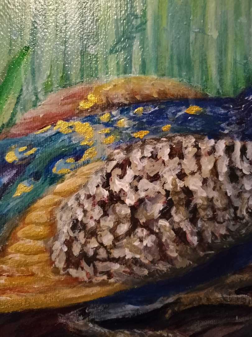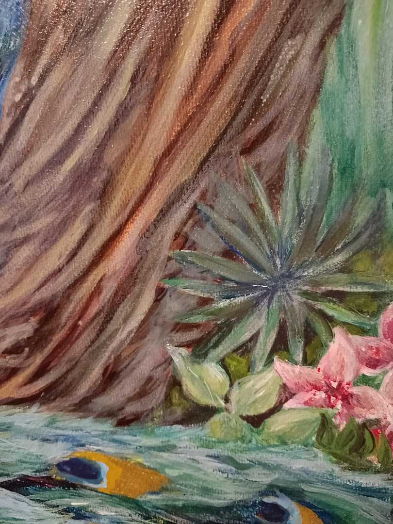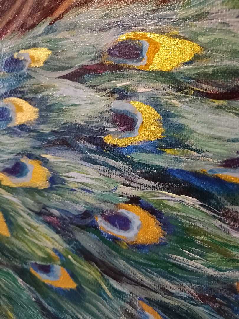 «Дикий павлин» – стилизованная работа, созданная по мотивам эскиза, пришедшего в полусне. Первозданность, роскошь природы, величественность, достоинство – все это воплотилось на полотне.
