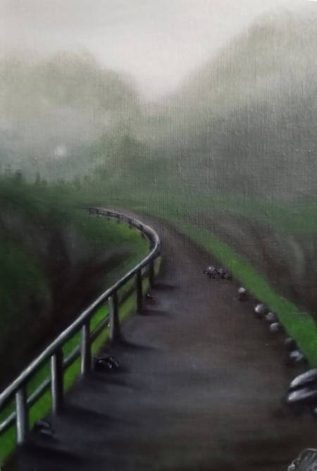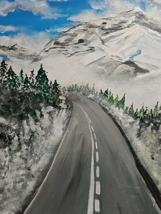 На картине изображен зимний пейзаж с извилистой дорогой, уходящей к горам.
