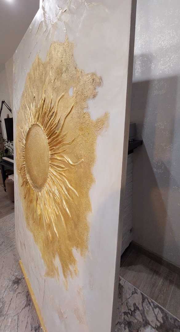 Картина в абстрактном стиле с изображением солнца, выполненная текстурной пастой, может значительно обогатить интерьер. Вот несколько аспектов, которые она может добавить: