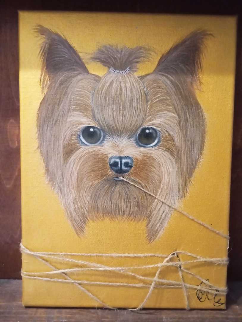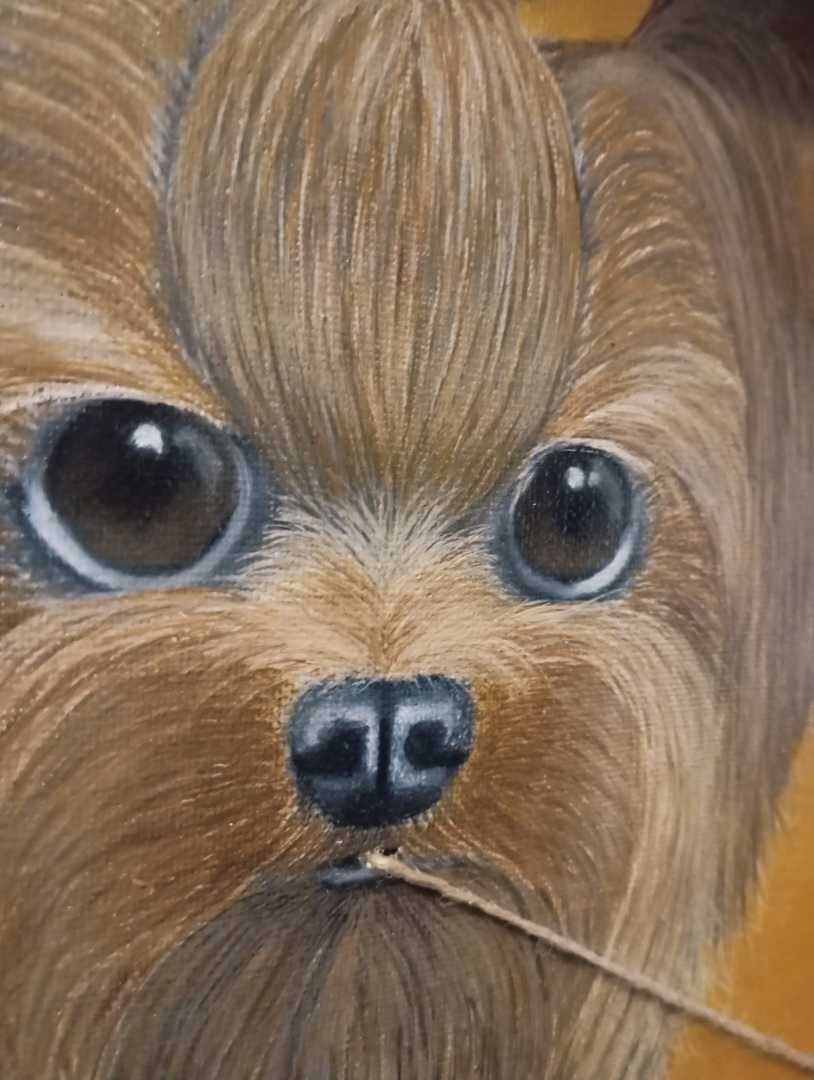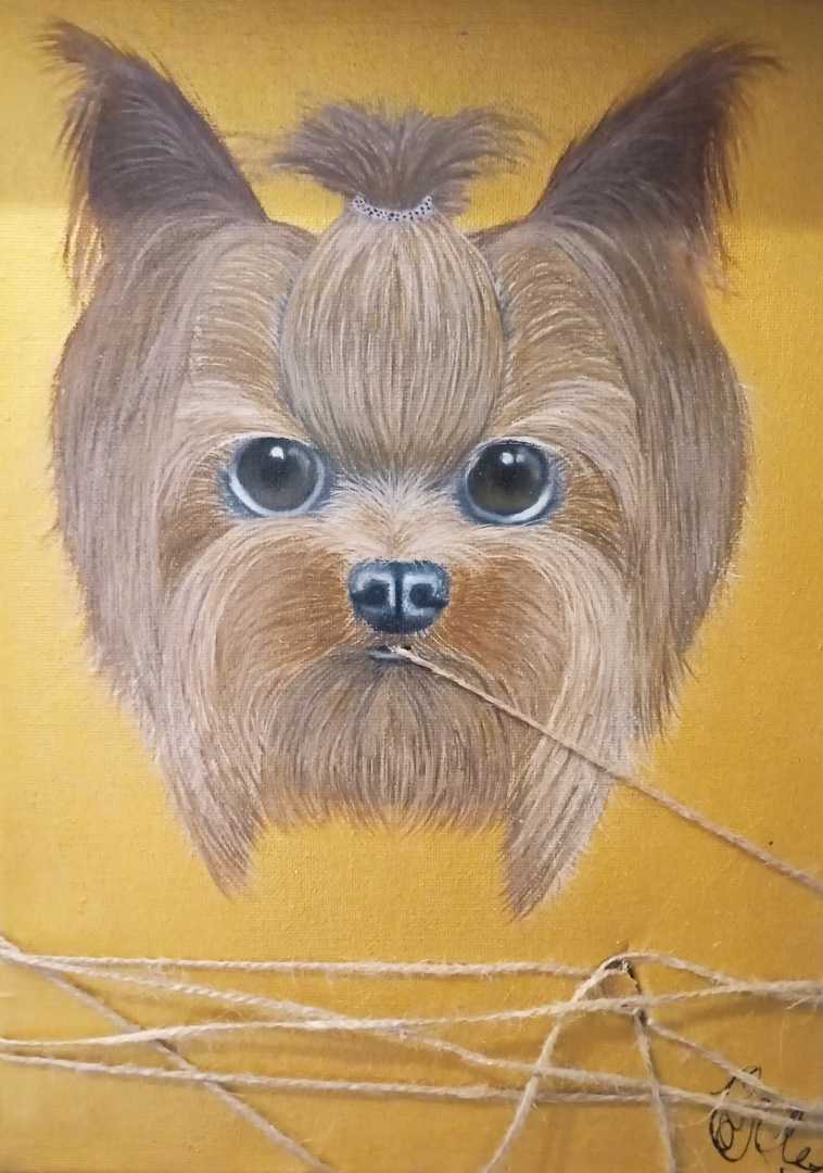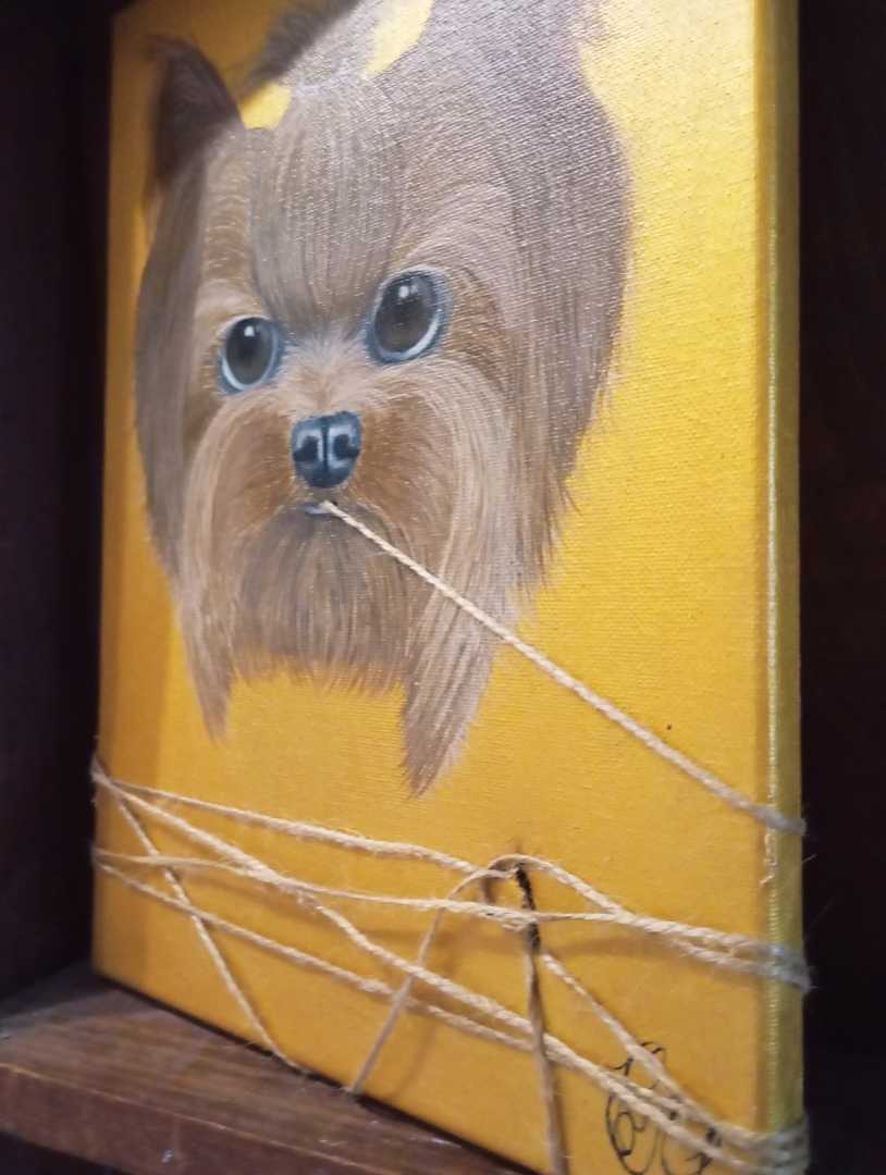 Картина в современном стиле собака держащая веревку во рту. Очень модное и интересное решения для современных картин картина золотая очень яркая фото не передает всю красоту