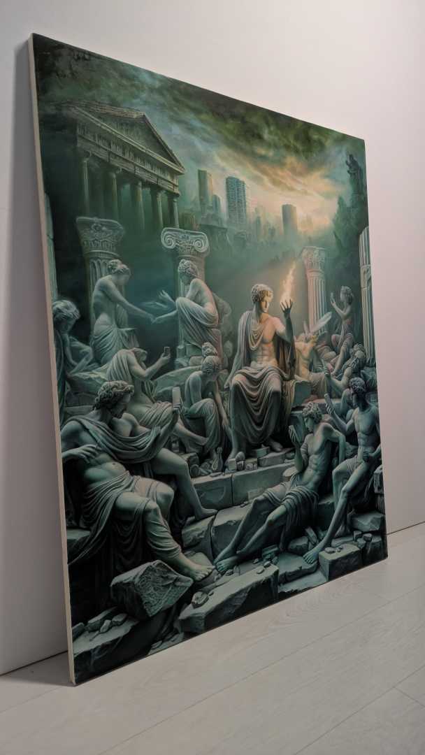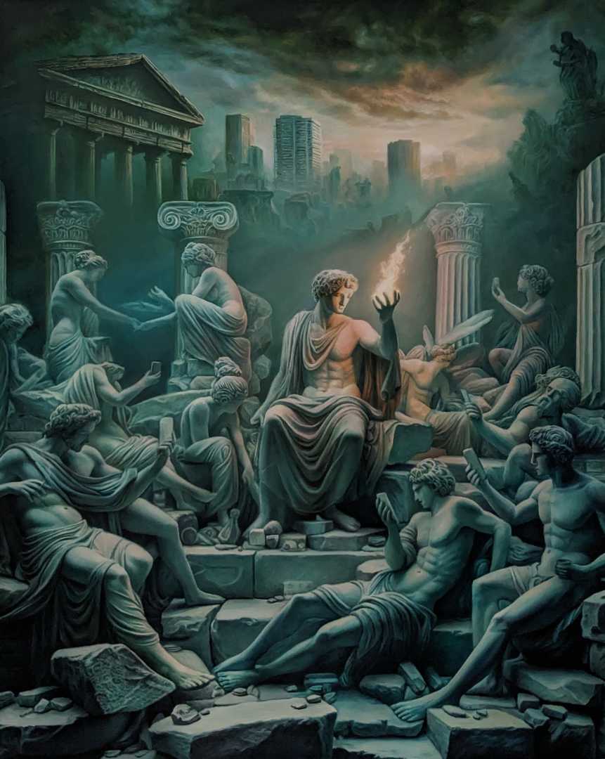 Первая картина в серии из 6 работ. Фигура в центре символизирует Прометея пламя которого боле никого не интересует. Людей больше увлекает свет от смартфонов, праздный образ жизни
