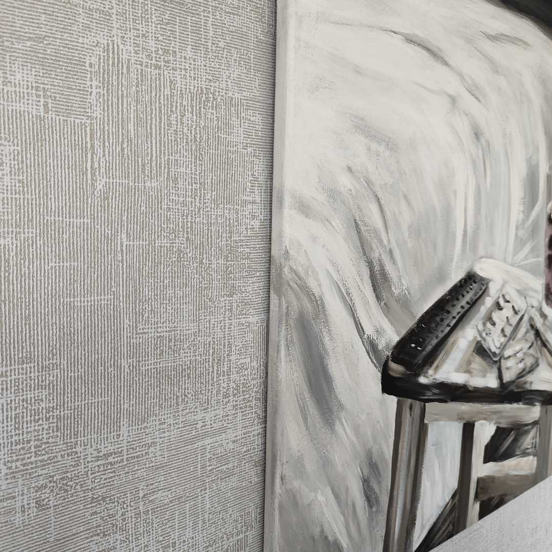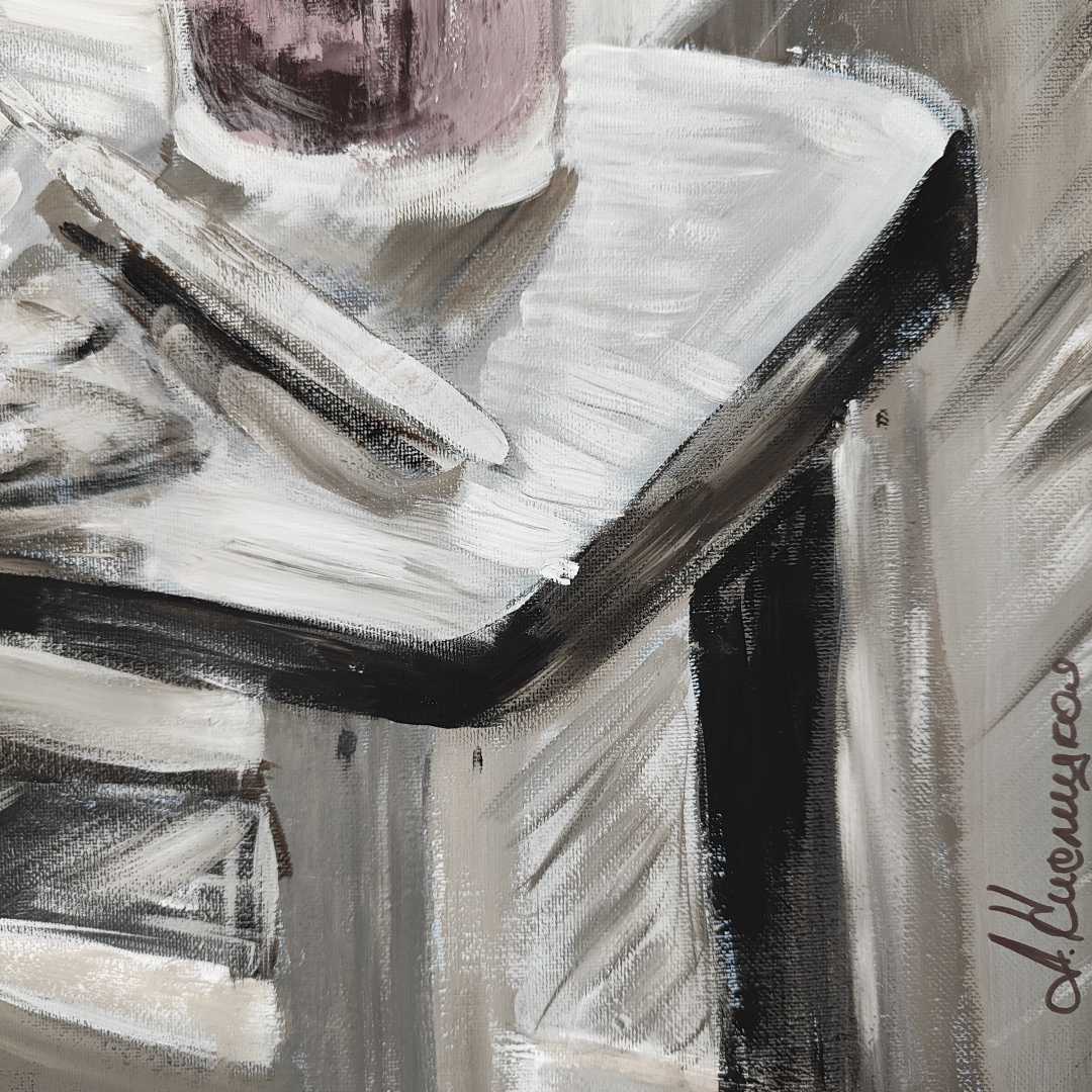 Перед вами монохромный интерьерный натюрморт, выполненный в живописной манере с активным использованием фактурного мазка. Это современная реалистическая живопись, где импрессионистическая свобода линий встречается с интимным, почти документальным сюжетом.