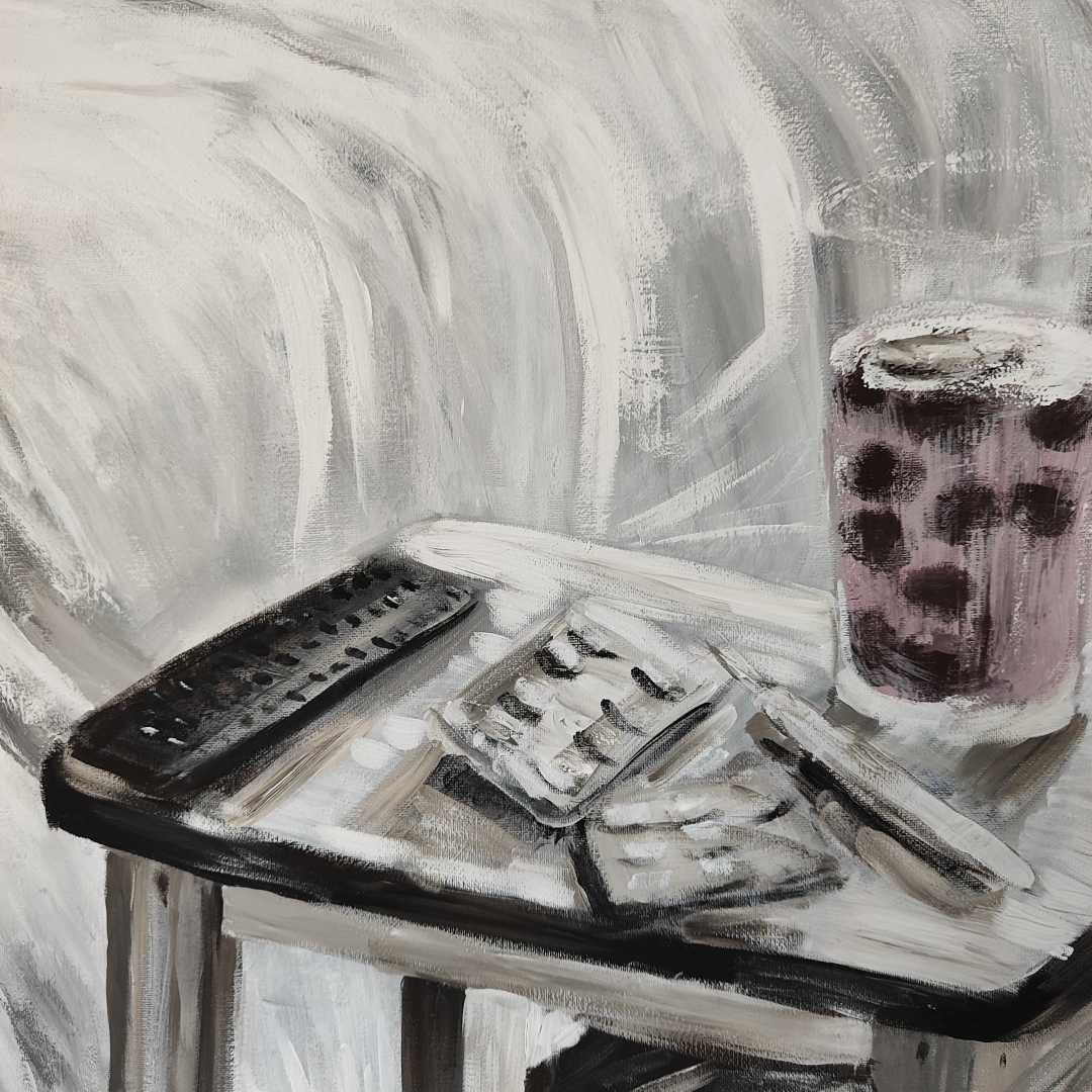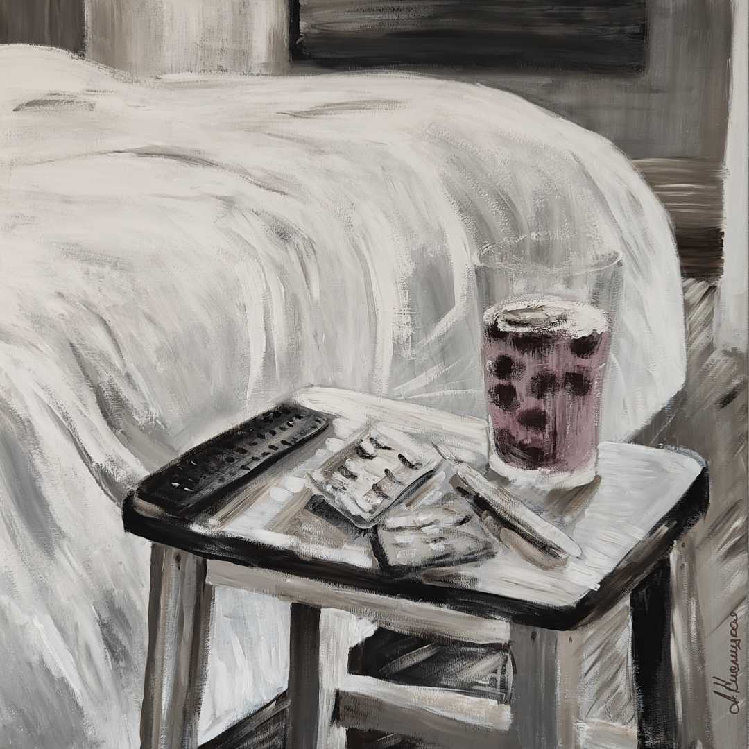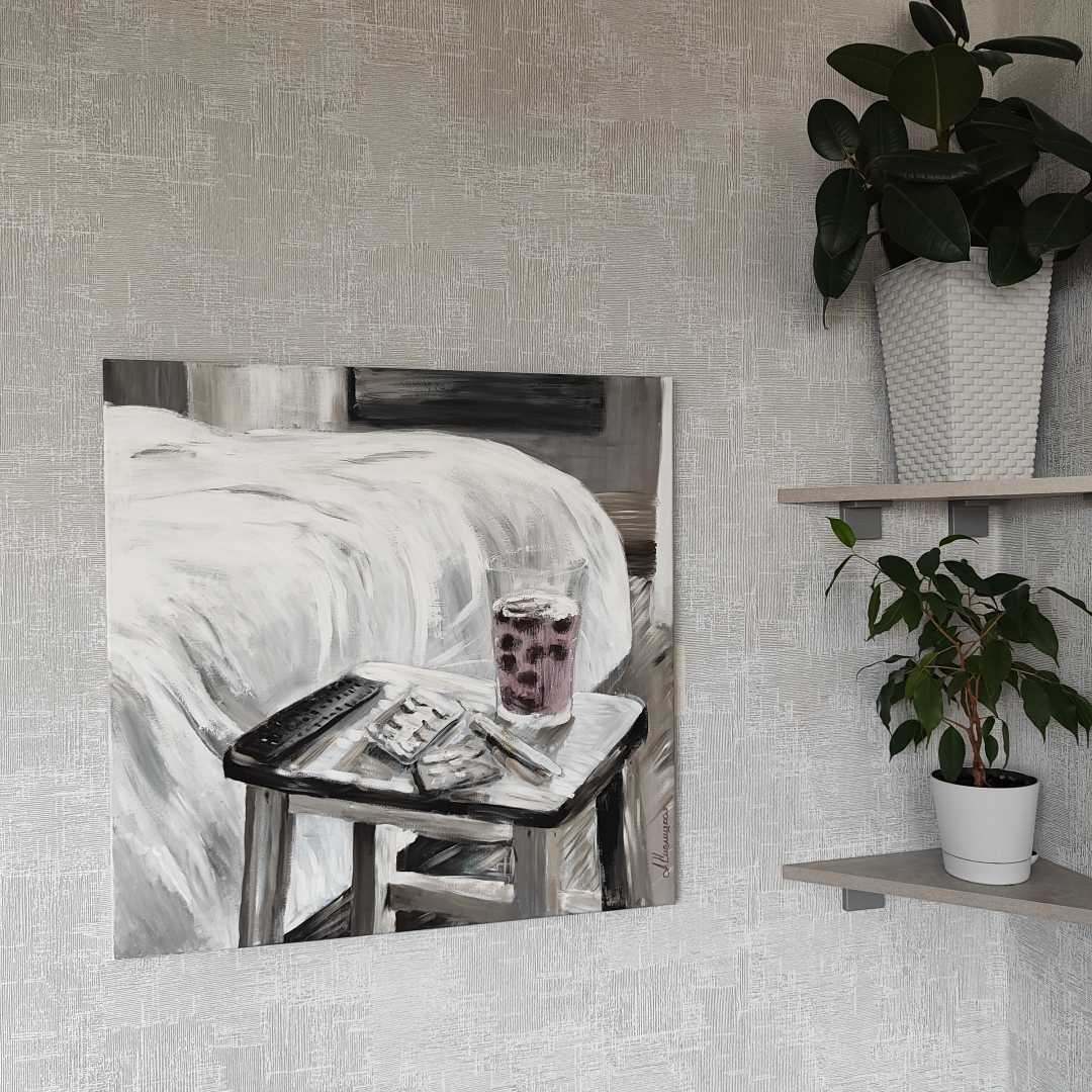 погружает зрителя в атмосферу тихой спальни: небрежно заправленная кровать, табурет у изголовья, на котором замерли случайные свидетели быта — блистеры лекарств, пульт, стакан с компотом. Пастельная, почти монохромная гамма и мягкая пластика мазков создают эффект зыбкого спокойствия и легкой недосказанности. Сюжет предельно прост, но каждый считывает его по-своему.