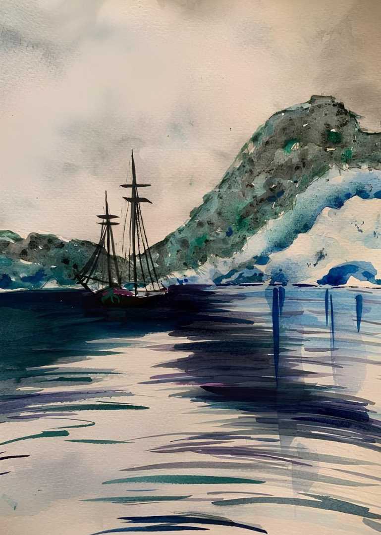 зумрудные оттенки горного берега передают прохладу и свежесть южного вечера, а темные силуэты корабля создают ощущение тишины и покоя. Вода здесь становится зеркалом, в котором отражается не только небо, но и сама суть путешествия - мечты, ожидания, движения. Техника акварели позволила передать легкость и прозрачность воздуха, игру света и теней, создав эффект растворения форм в пространстве. Этот пейзаж наполнен ощущением свободы и бесконечности морских просторов.