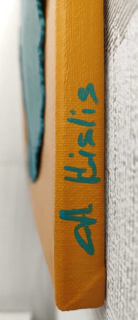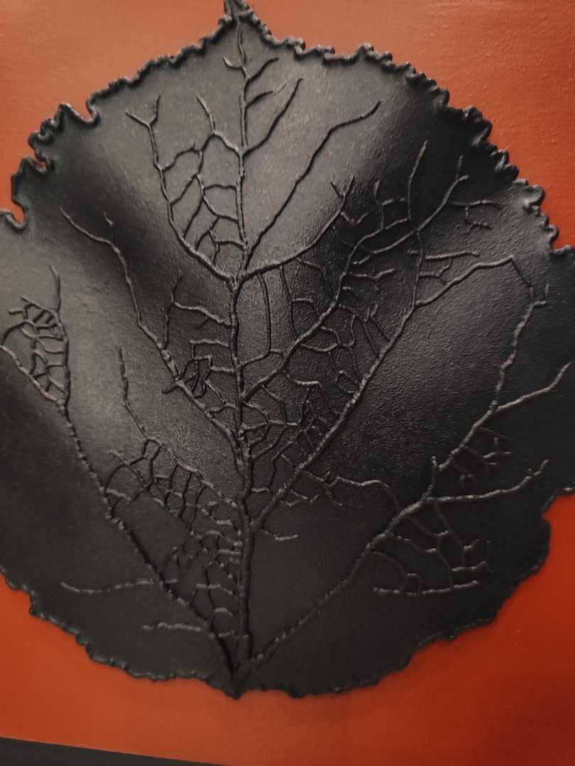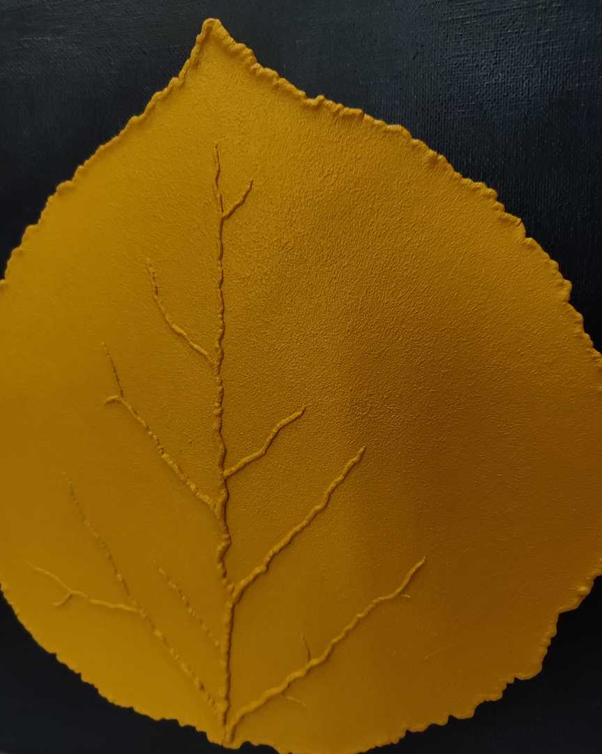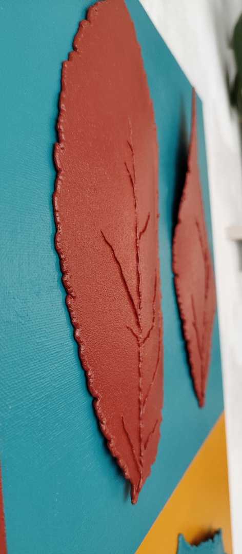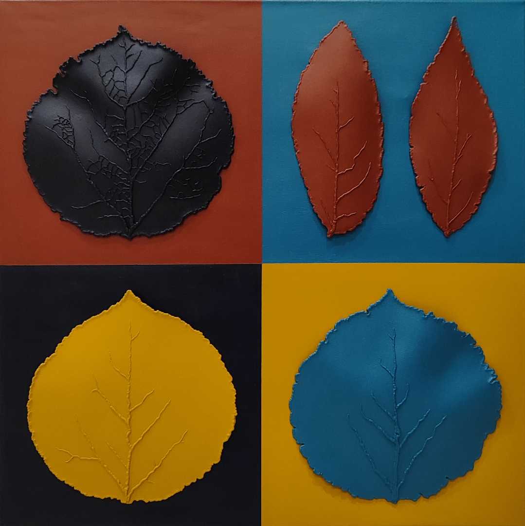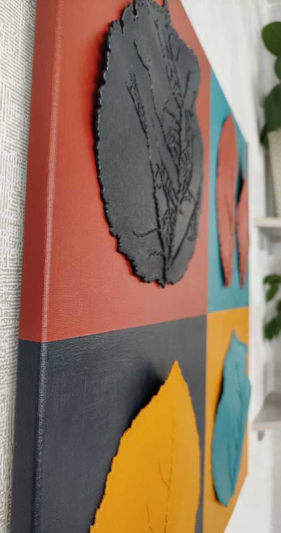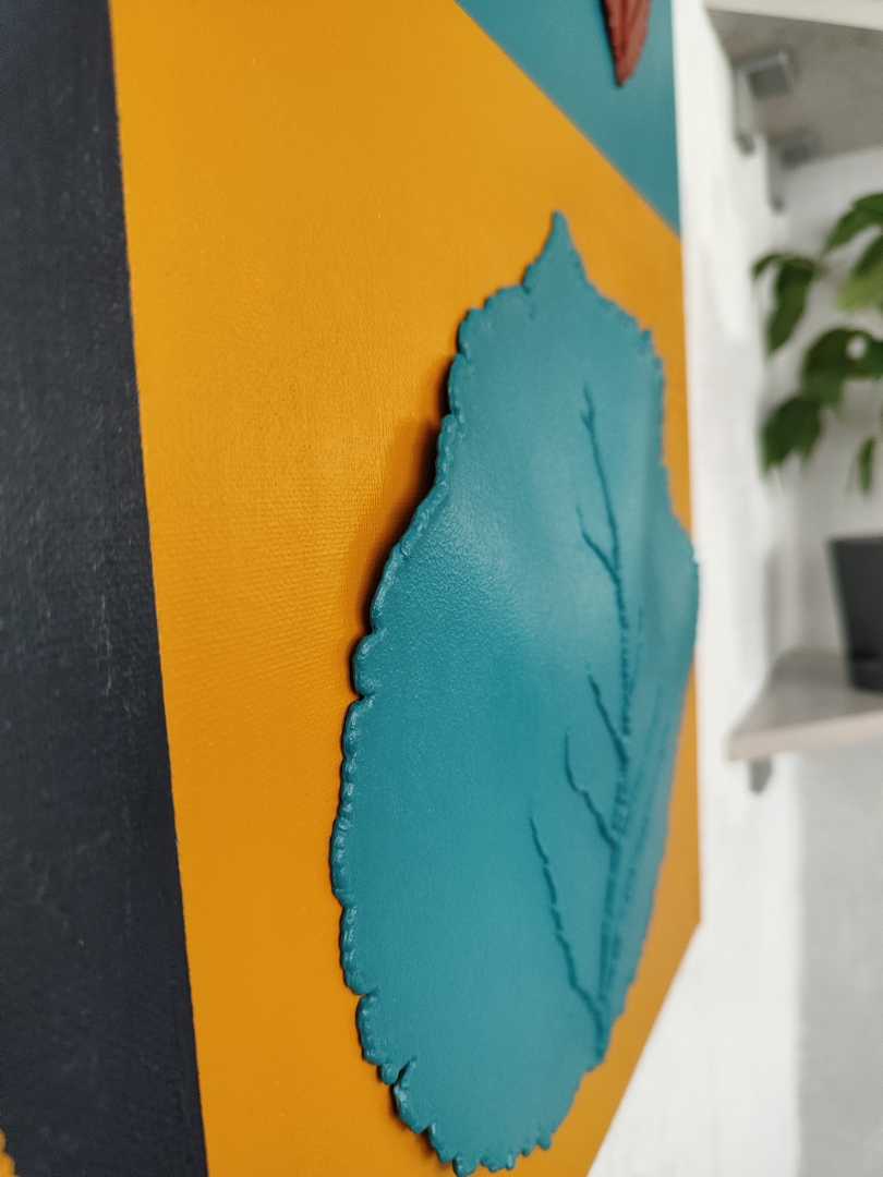 Четыре поля, четыре листа — современный гербарий, где природа встречается с геометрией. Каждое листовое «пятно» сформовано отдельно и приклеено на холст, создавая неглубокий рельеф: видны края, прожилки и тени от выступающей поверхности. Контрастные пары цветов (терракотовый/бирюзовый, жёлтый/чё